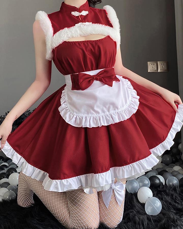 肩まわりのふわふわがあざと可愛い?メイドライクなサンタコスチュームで周りと被らずオシャレなクリスマスに♪【Mサイズ】バスト60cm ウエスト56cm 着丈77cm【セット内容】ワンピース+エプロン+カチューシャ商標登録済み第594880号milkytime特製パッケージにてお届けします。