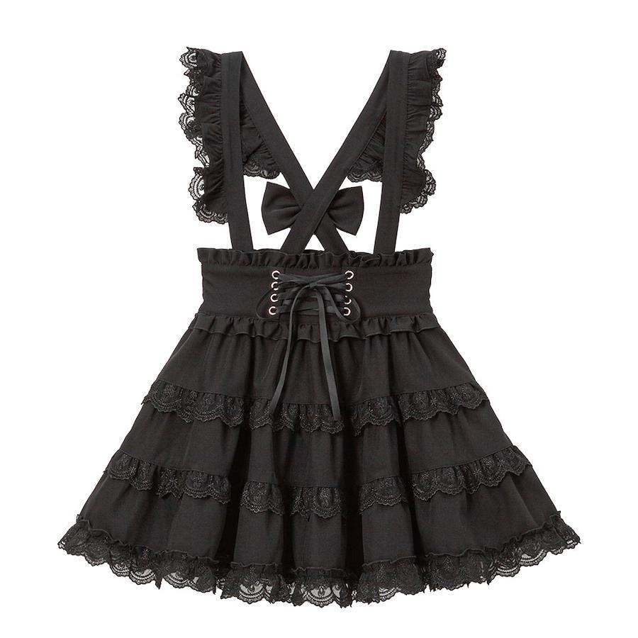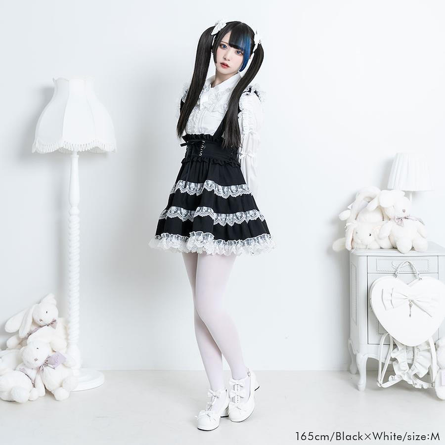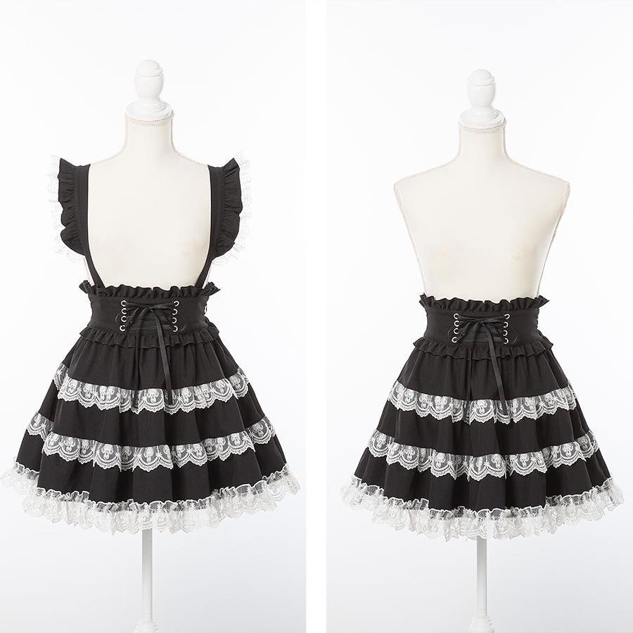 ギャザーたっぷりのレースがミルフィーユみたい♪歩くとふわふわと揺れるフリルがとびきり可愛いスカート♪【デザイン】ハリ感のある生地にたっぷりとギャザーを寄せ、繊細な柄のチュールレースをトッピング。歩くとふわふわと揺れるたっぷりのレースがとびきり可愛い♪サスペンダーにもフリルとレースをあしらい、とことん甘いデザインに。短めの着丈がかわいらしさを一層引き立ててくれること間違いなし♪少し幅広のウエストベルトがウエストをすっきりと見せてくれます。肩紐の長さはボタンで調節可能なので、若干の着丈調整が可能。後ろの肩紐についたリボンは取り外し可能。裏地あり・便利な脇ポケット付きです。【素材】本体にはハリのあるしっかりとした素材を使用しております。繊細な柄のチュールレースを使用しております。引っかけなどにご注意ください。【コーディネート】フリルたっぷりのブラウスと合わせてとびきり甘いコーデがおすすめ♪サスペンダーは取り外し可能なので、色々なコーデにあわせてみてください。着丈を短めにお作りしておりますので、ペチパンなどのインナーをご着用くださいませ。《透け感》なし 《生地の厚さ》厚手 《裏地》あり 《伸縮性》なし《生産国》中国