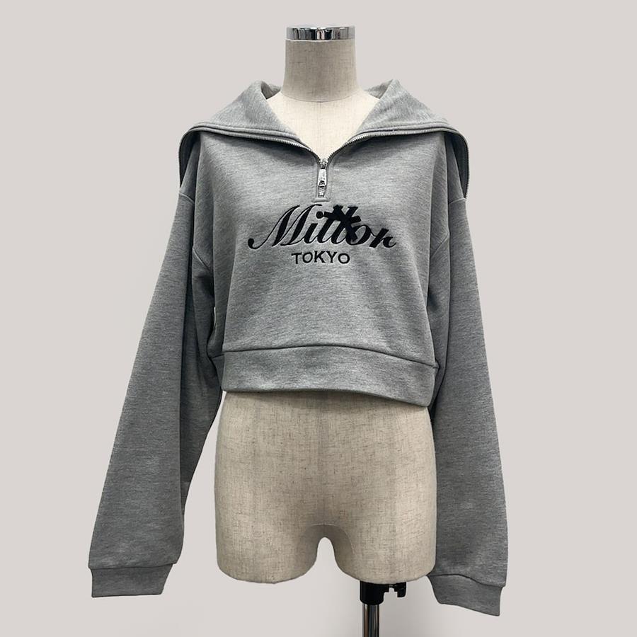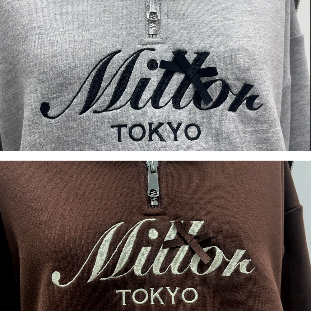 スウェットをMillor TOKYOらしくアップデート♪【デザイン】まるでケープのようなビッグカラーがお顔周りをすっきりと魅せてくれるアイテム。ファスナーの開き具合によって、ハイネックにしたりセーラー襟にしたり雰囲気を変えてお召しいただけるところもポイントです。また、大胆にあしらったロゴ刺?にはワンポイントでリボンを縫い付け、遊びゴコロをプラスしました。ゆったりとした着心地なので、お出かけはもちろんリラックスシーンにもぴったりなマストハブアイテムです!【素材】ほどよい厚みの裏毛素材です。製造過程上、濃色(ブラウン、ブラック)のみやや硬めの生地感となっております。《透け感》なし 《生地の厚さ》普通 《裏地》なし 《伸縮性》なし《生産国》中国