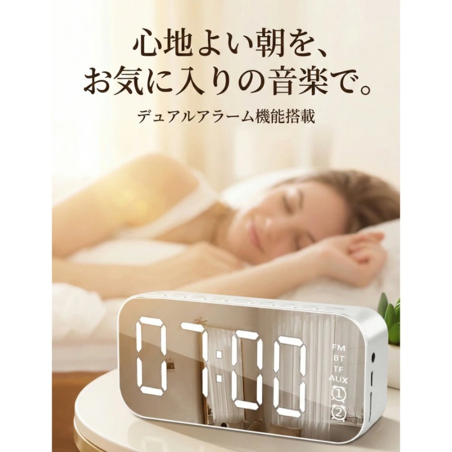 ベッドサイドやデスクに置くだけで、デジタル時計・Bluetoothスピーカー・目覚まし(デュアルアラーム)として活躍。ミラー仕上げのスタイリッシュなデザインで、インテリアにもなじみます。