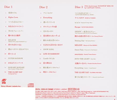 [DISC3]25th Anniversary NONSTOP MIX CD by CAPTAIN VINYLM1 つつみ込むように・・・ <DJ WATARAI REMIX feat.MURO>M2 アイノカタチ <MURO 12'' REMIX>M3 La La La <Original K Dope Mix>M4 Escape <DJ WATARAI REMIX>M5 SHININ' ~虹色のリズム~ <Joe Claussell Club Love Ny Vocal Remix>M6 眠れぬ夜は君のせい <Joe Claussell Remix>M7 Shining Star <DJ Spinna Remix> MELODY <Masters At Work REMIX>M8 Sweet Pain <Francois K. Dub Remix>M9 SWEETNESS <Satoshi Tomiie Remix>M10 Into The Light <DAVID Dub Mix>M11 太陽がいるから <Frankie Knuckles Remix>M12 Everything <Junior + Gomi Remix>M13 THE GLORY DAY <DJ EMMA NEW MIX>M14 果てなく続くストーリー <Smooth Latin Remix>
