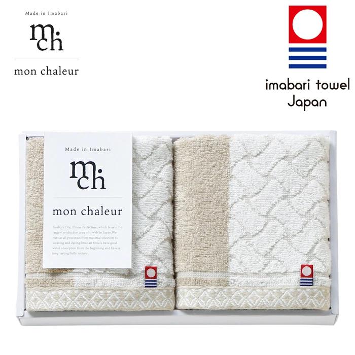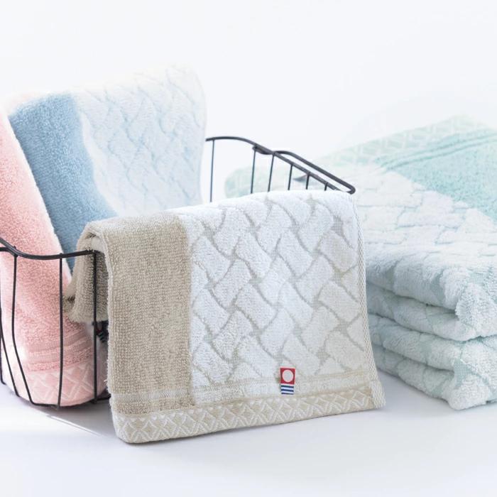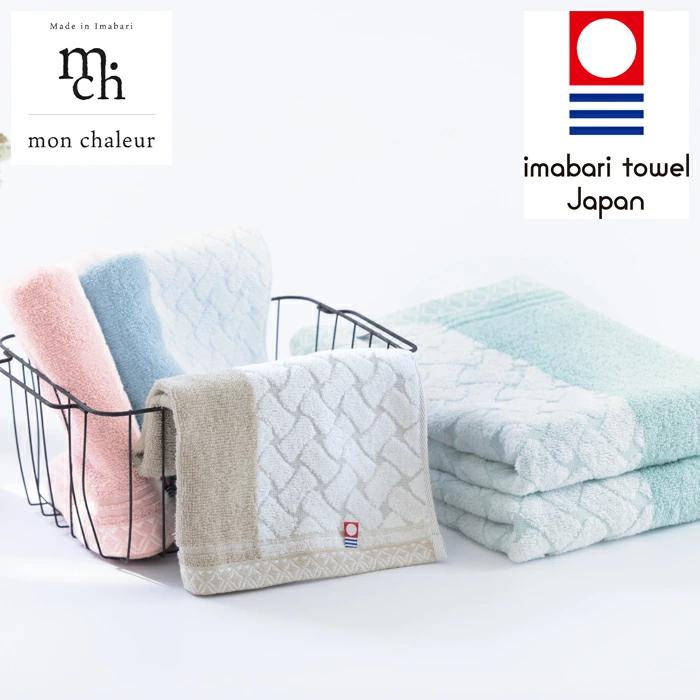 「あたたかな」を意味するフランス語「chaleur」と「世界」を意味する「mond」から名づけられたMonChaleur。やわらかであたたかみのあるやさしい色合いのタオルです。縦に2つの色を配し、右側の縄の網目のような模様が特徴です。