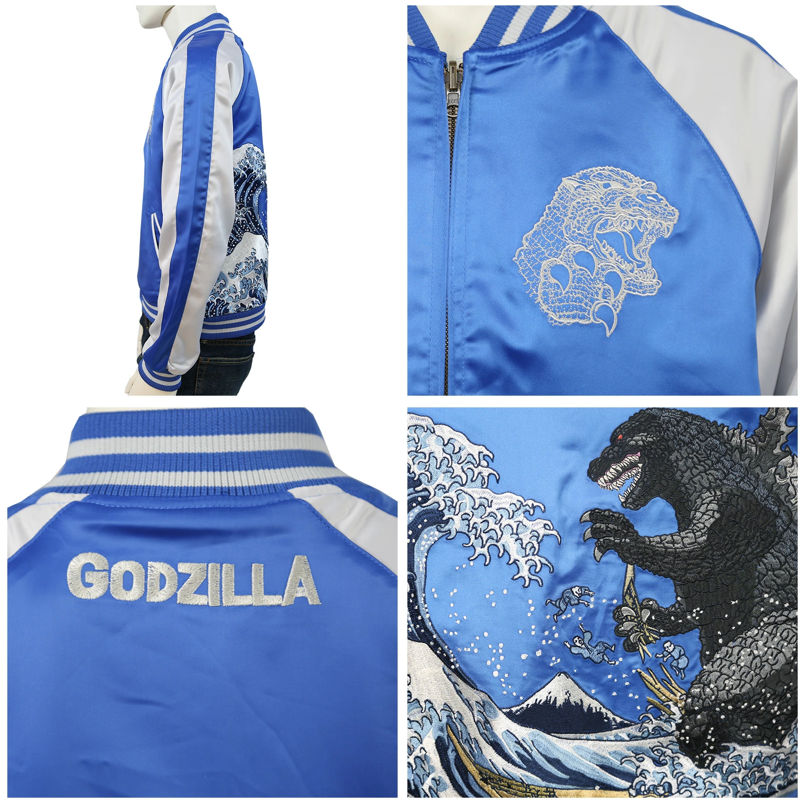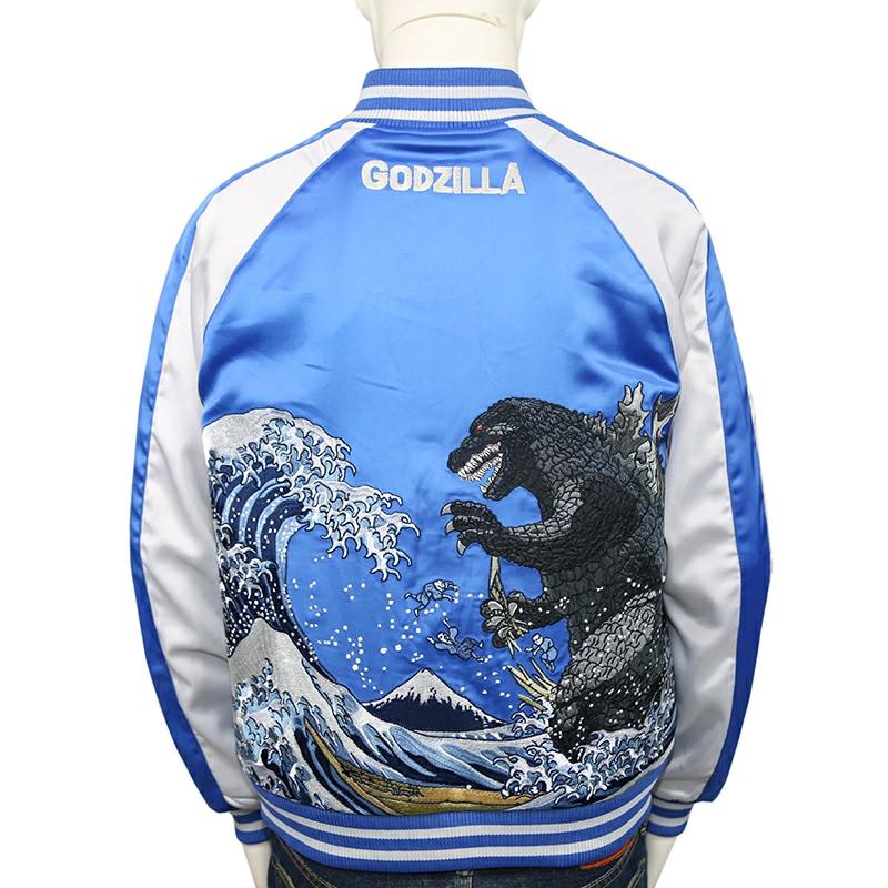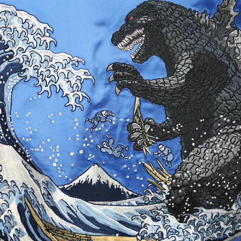 葛飾北斎の代表作【神奈川沖浪裏】をモチーフに力強く荒波の中立つゴジラを背中一面にした、直球デザインの逸品。