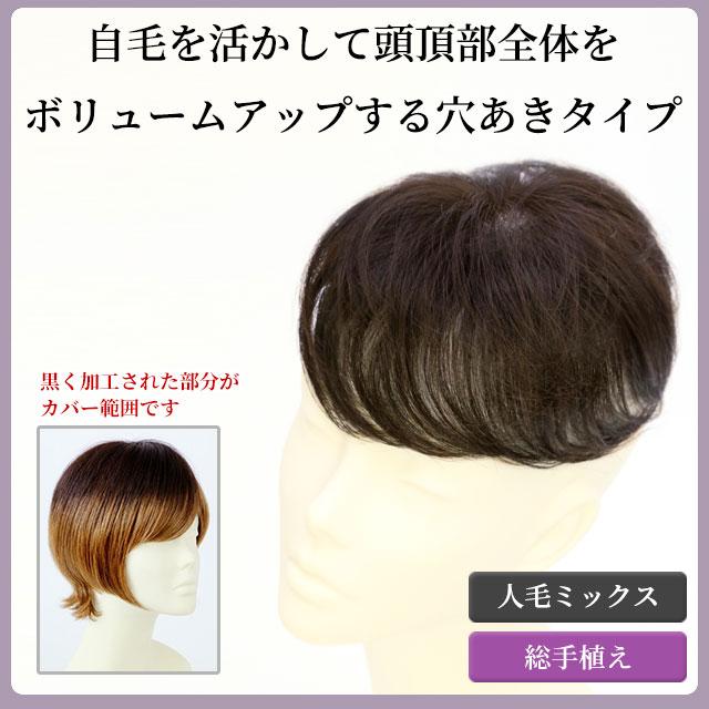 1本1本手植えを施し、自然な毛の立ち上がりが魅力の総手植えカバーピース。 自毛を活かして頭頂部全体をボリュームアップ(穴あきタイプ)【素材】