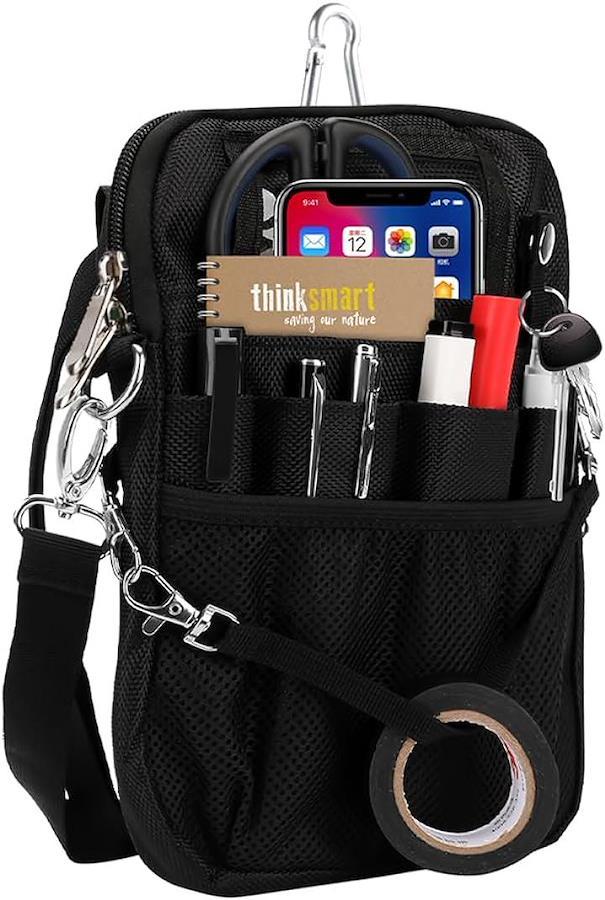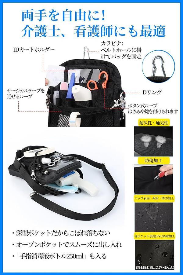*マチ2.5cm大容量、12ポケットと多数の機能を兼ね備えた仕事用ウエストポーチ。 v「ダブルファスナー・縫製強化仕様 」お客様からご要望により、メインポケットのファスナーをダブルファスナーにしました。カラビナも強度UP版に変更し、ベルトループ部分の縫製も2重縫製で強化。 v「12個の大小複数ポケット」iPad mini、A6・B6ノートなどが入る大きめのポケット、貴重品や鍵が入れられる内部ファスナー付きポケット、ペンやドライバーなどの入る細長いポケット、小物収納にぴったりのメッシュポケットなど大小複数ポケットを装備。「消毒液ボトル250ml」も入るので、ナースオーガナイザー・ワークポーチとしても便利です。