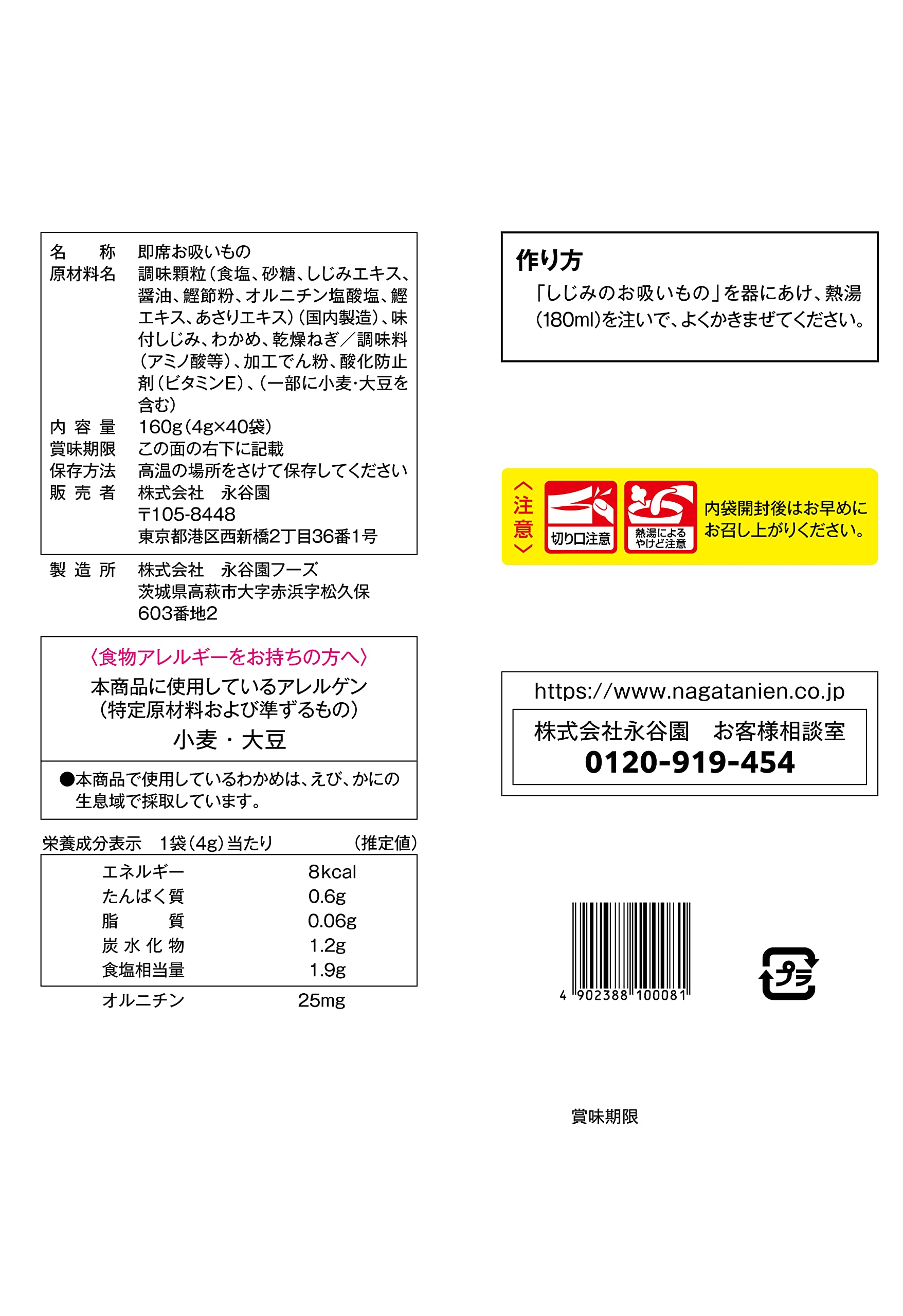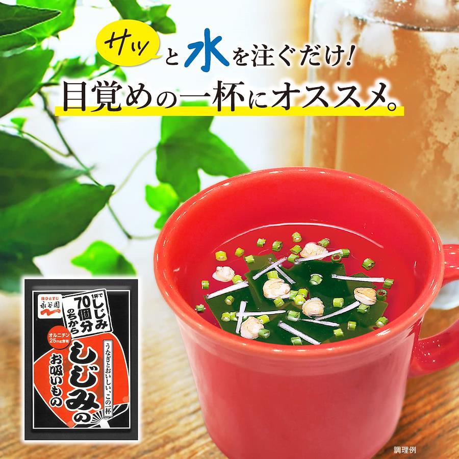 調味顆粒(食塩、砂糖、しじみエキス、醤油、鰹節粉、オルニチン塩酸塩、鰹エキス、あさりエキス)(国内製造)、味付しじみ、わかめ、乾燥ねぎ/調味料(アミノ酸等)、加工でん粉、酸化防止剤(ビタミンE)、(一部に小麦・大豆を含む)