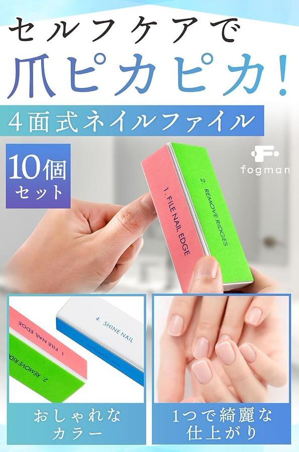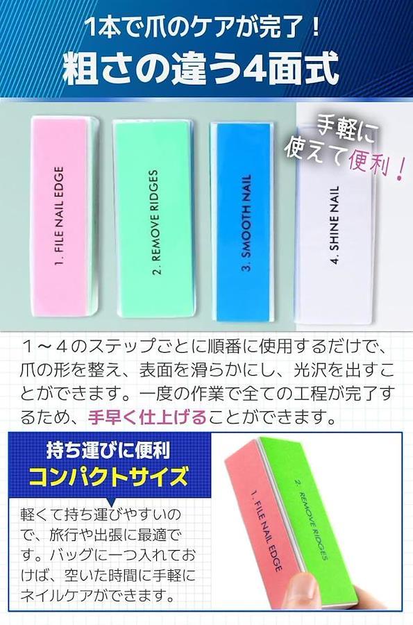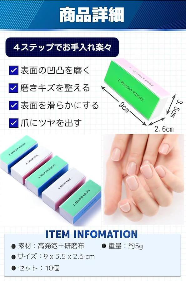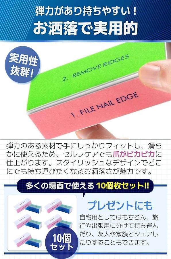 「商品特徴」(1)1つで綺麗な仕上がり:4つの面で爪に自然な輝きが生まれる/(2)持ちやすいデザイン:程よく弾力があり力を入れずに磨ける/(3)お洒落なカラー:年齢や性別を問わず使いやすいカラー/(4)嬉しい10個セット:自宅用や外出用、プレゼントにも