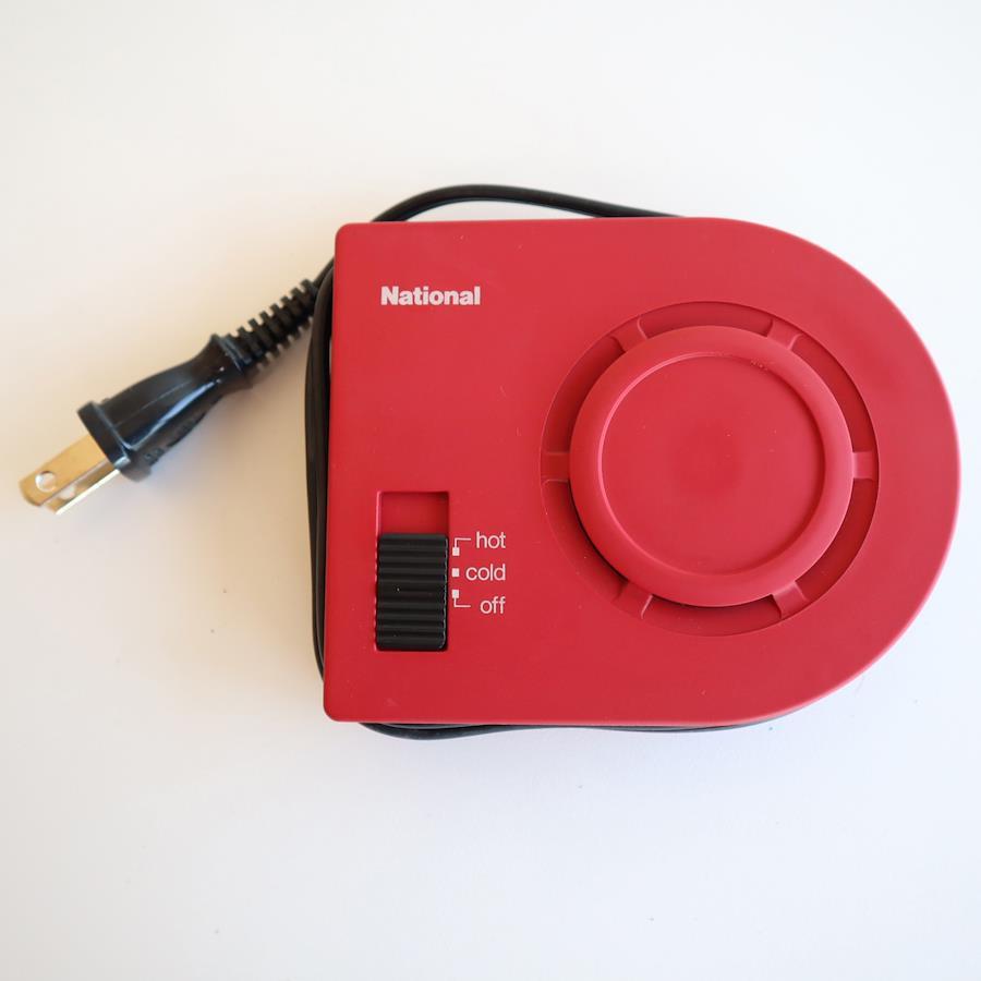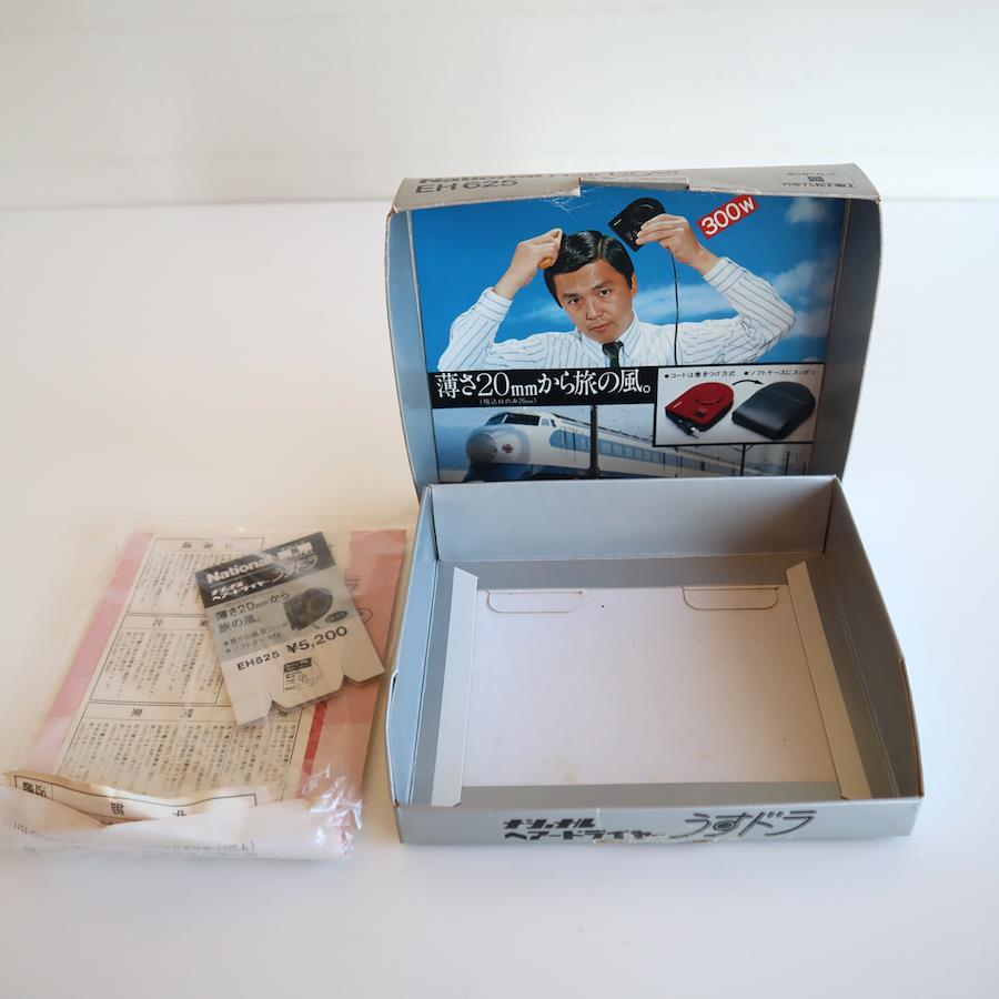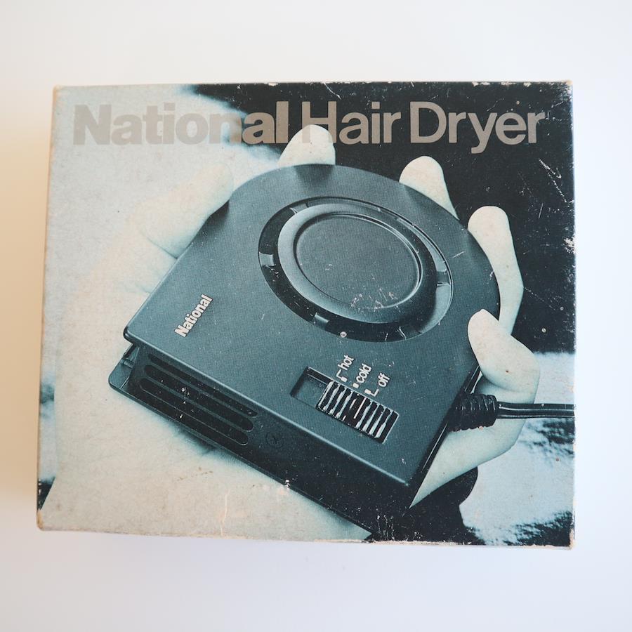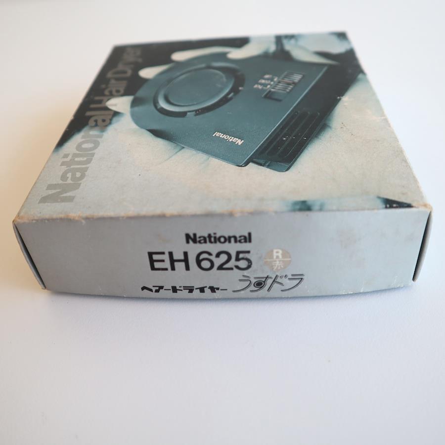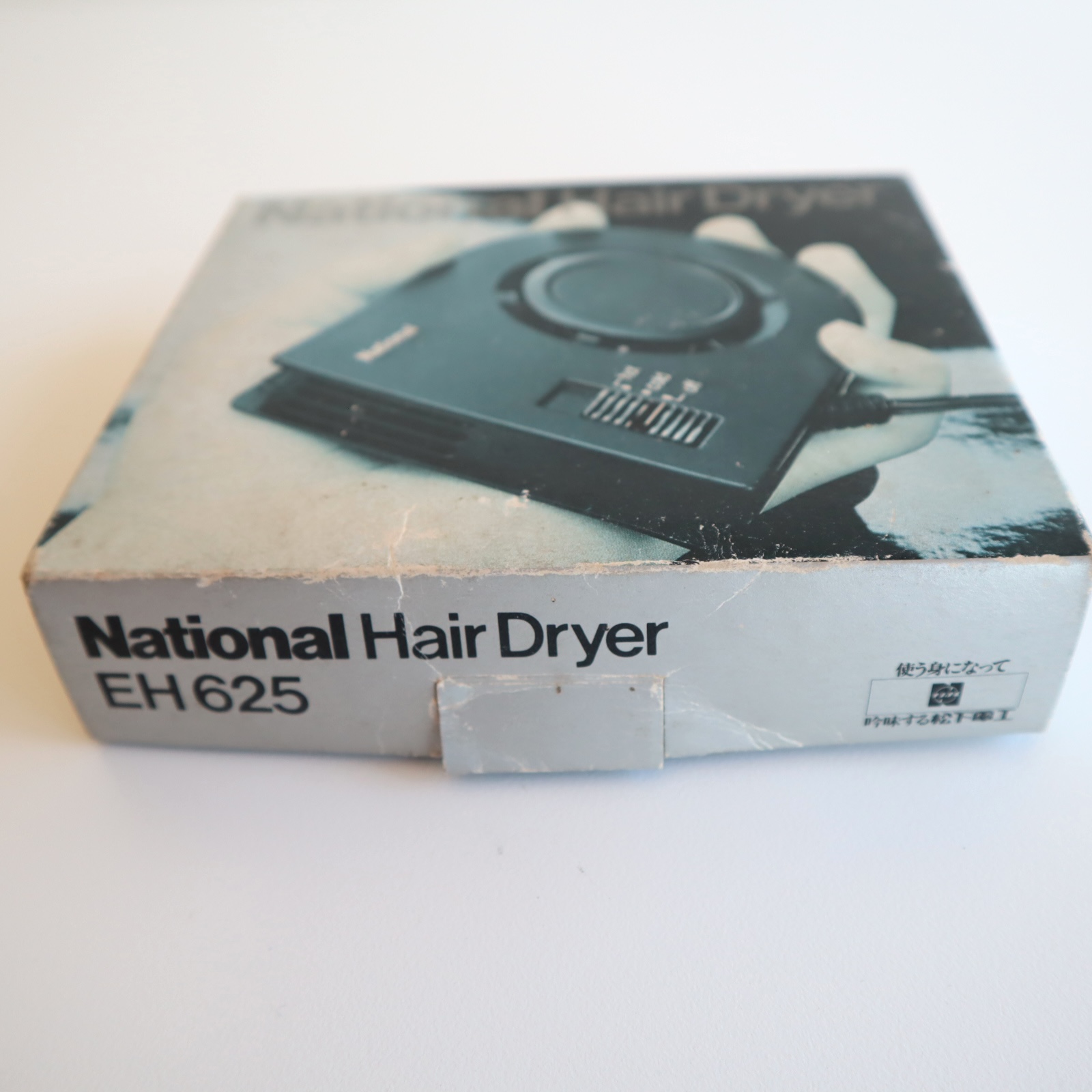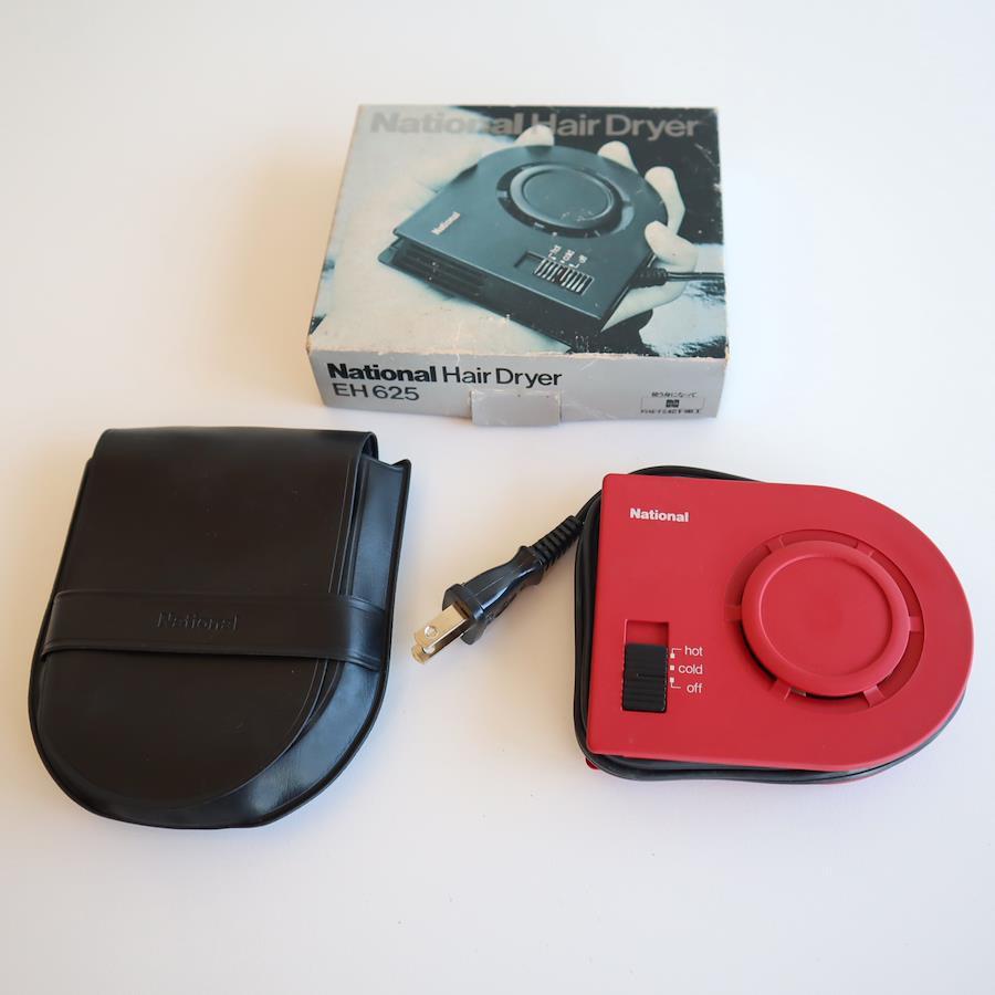 昭和の名機「National EH625」ヘアドライヤーです。薄さ約20mmの携帯設計で、当時“旅の風”として人気を博したコンパクトモデル。現代の製品にはないレトロデザインと、ナショナル時代ならではの質感が魅力です。