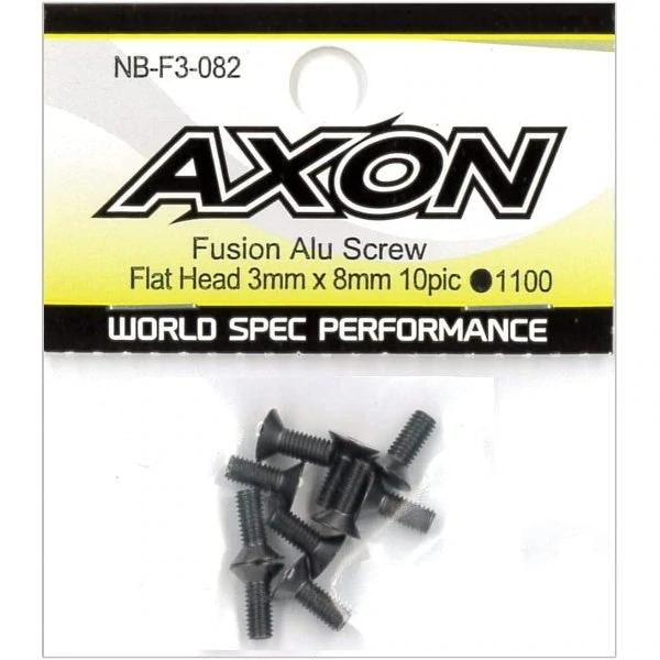 AXON Fusion Alu Screw (Flat Head 3mm x 8mm 10pic) NB-F3-082 新発想で最適なシャーシロールを生み出すフュージョンアルミスクリュー。アクソンフュージョンアルミスクリューは特殊なコーティングを施し、ビスを適度に潤滑させ理想的な締め付けトルクがかかるよう作り出された、これまでにはない新発想のアルミビスです。しかもとても軽量なアルミ素材でありながらこれまでのアルミビスに比べ剛性を持たせるべく最適な熱処理を施したため、しなやかなシャーシロールを得つつスタビリティの高いマシンに仕上がります。