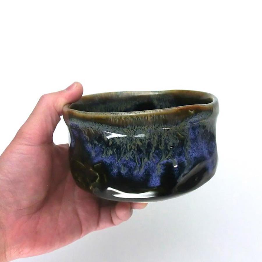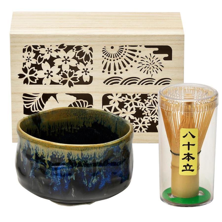 This is a Brand New Matcha Bowl and Whisk Set, perfect for enjoying traditional Japanese green tea (Matcha) at home 🍵. The unique glaze on the Chawan (Matcha Bowl) is often called "Seika" (青果), featuring stunning blue and black colors.