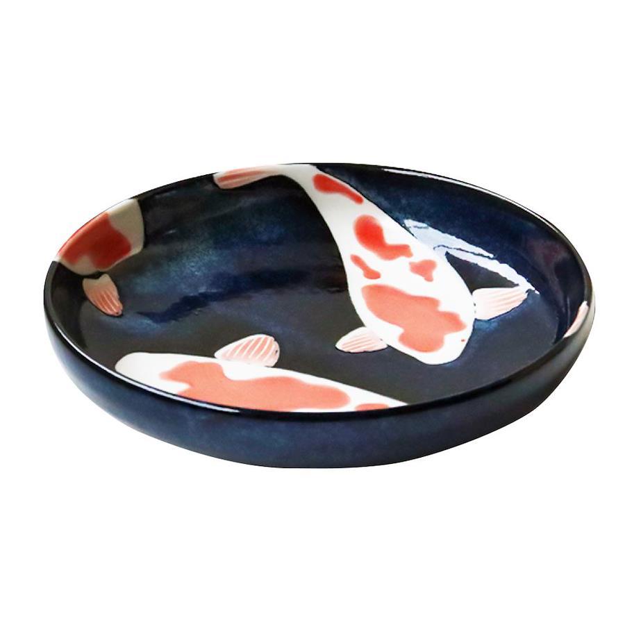 This is a brand new, Japanese-style shallow bowl, typically used for serving pasta, salads, or noodle dishes (Donburi). The interior features a vivid blue and white Koi (Carp) fish design. 🎏