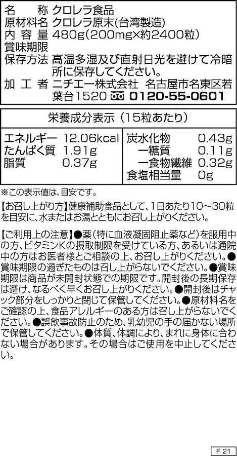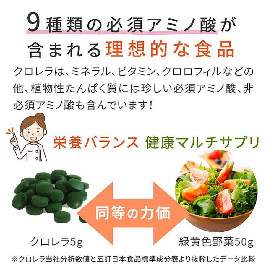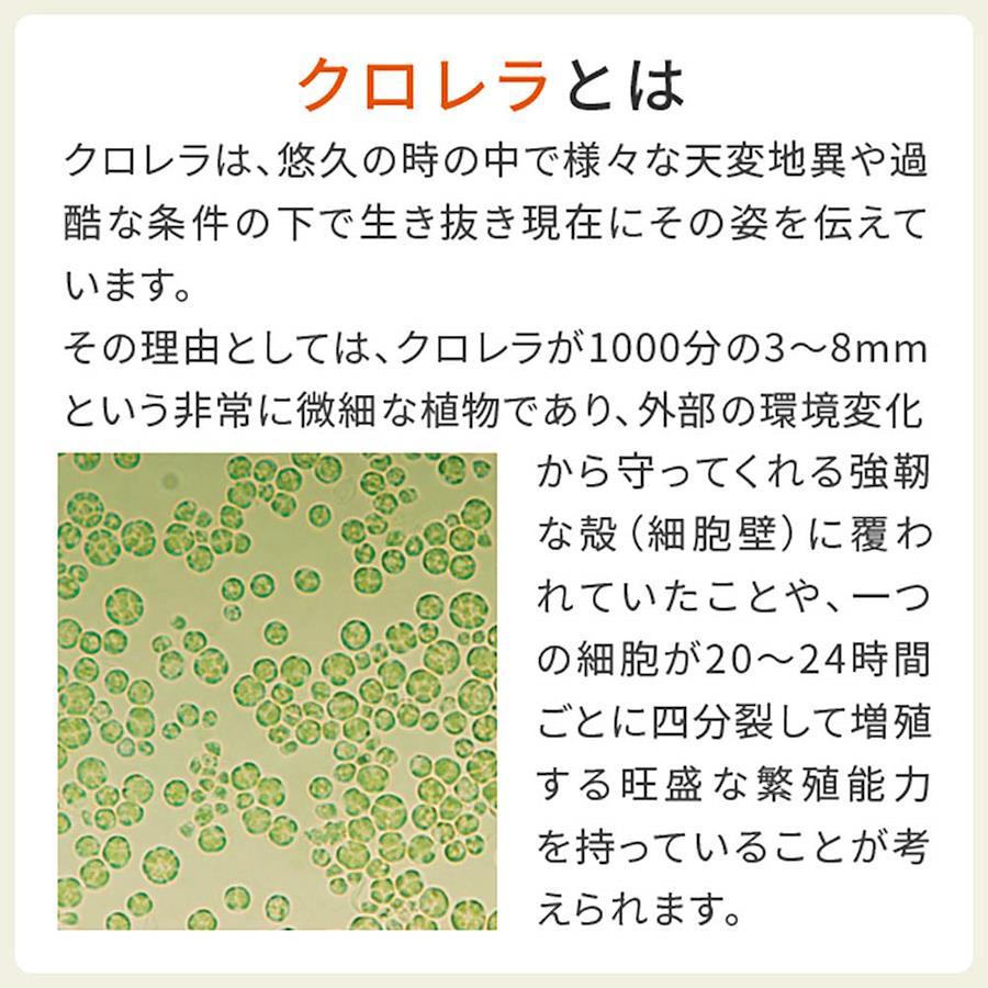 ■サイズ:天然培養クロレラパウダーをそのまま錠剤化!無添加にこだわった、栄養たっぷりのクロレラ100%サプリです。 天然培養クロレラパウダーをそのまま錠剤化!無添加にこだわった、栄養たっぷりのクロレラ100%サプリです。 クロレラには、健康的な身体に重要なタンパク質、ミネラル、ビタミン、さらにはクロロフィルなど、緑黄色野菜の基本栄養素を多量に含んでいます。 クロレラは、9種類の必須アミノ酸をバランスよくとることができ、非必須アミノ酸もたっぷり含まれているので、加齢とともに体内での合成が減少していくアミノ酸もしっかりと補うことができます。 太陽の光を浴びて育つ屋外培養は日本と親交が深い台湾で行われています。工場は安心・安全の基準でもある食品GMP・ISO9001・IS9002取得工場で生産されています。残留農薬検査、525項目も実施済。 原材料名:クロレラ原末(台湾製造) 栄養成分表示(15粒あたり)/エネルギー 12.06kcal、たんぱく質 1.91g、脂質 0.37g、炭水化物 0.43g(糖質 0.11g、食物繊維 0.32g)、食塩相当量 0g ■重要なお知らせ
