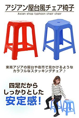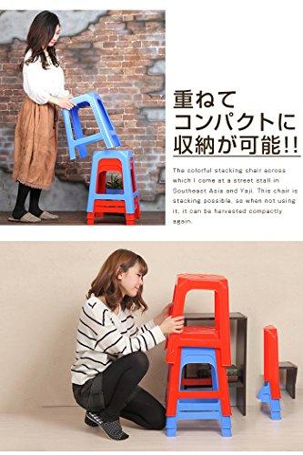 東南アジアの屋台や夜市で見かけるような、カラフルなスタッキングチェアです。【サイズ】上側座部分:約26x26cm、下側足部分:約35x35cm、高さ:44㎝、耐荷重量:約80㎏軽量で丈夫な、スタッキングできる椅子です。使用時以外は積み重ねて省スペースでコンパクトに収納できます。水洗いできるので、屋内外どちらでもお使いいただけます。ご自宅や店舗、屋台やイベント等、様々な用途で活躍します。目を引く鮮やかなカラーなので、お部屋のインテリアとしてもお使いいただくのも良いですね。プラスチック素材で軽量なため、女性やお子さまでも重ねた状態でラクラク運べます!◆◇注意事項◇◆本製品は、東南アジア諸国向けの商品を輸入した物になります。現地向け商品の為、検品はしておりますが、細かいすり傷、小傷、輸送時の傷、バリ等がございます。