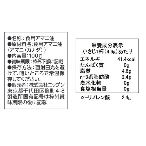 アマニ油100g 1本。食用のゴールデン種のアマニからコールドプレス製法(低温圧搾法)で抽油。アマニ油小さじ1杯(約4.6g)で、オメガ3のα-リノレン酸を約2.5g(1日の摂取目標量)摂ることができます。TVでも紹介された、小さじ1杯でカラダがよろこぶ話題のオイルです。いつも新鮮!携帯サイズ(5g)が30個入った『アマニ油ミニパック』絶賛発売中!アマニの粒をローストし、香ばしく食べやすい『ローストアマニ粒』とそれを粉末にした『ローストアマニ粉末』お試しください。【重要】メーカーによる商品リニューアルに伴いパッケージ(内容量も含む)変更が行われた場合、新パッケージでお届け致します事ご了承願います。