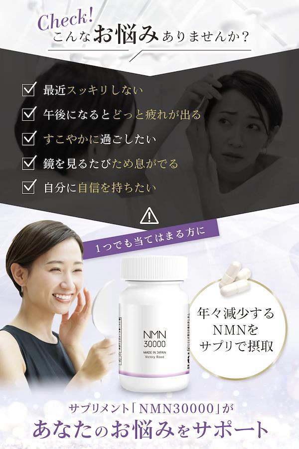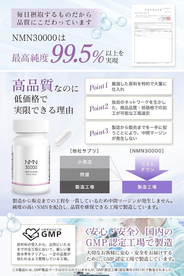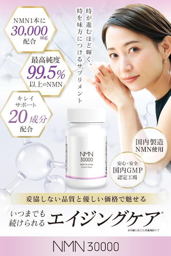 ■サイズ:??5.5x5.5x11cm;90g ?【業界トップクラスの高純度と品質】国内製造 NMN(ニコチンアミドモノヌクレオチド)を1本に「30,000㎎」と高配合。更に酵母発酵法で抽出され,業界トップクラスの純度99.9%以上(真正試験済み)のβ-NMNを採用。3粒で600mgのNMNの摂取が可能です。更にMSMも贅沢に配合!毎日手軽に摂取できる次世代エイジングケアで年齢を感じない、いつまでも光り輝く自分に。 ?【ユーグレナ(ミドリムシ)を始めとしたキレイサポート成分を贅沢配合】ユーグレナ、リコピン、αリポ酸、レスベラトロール、クロレラ、ノニ果汁、プラセンタエキス、ザクロ、コンドロイチン、アロエ、ヒアルロン酸を贅沢に配合。 ?【効率的に摂取可能な小型カプセル】ビクトリーロードはカプセルにもこだわり、「効率的に摂取可能な小型カプセル」を採用。通常のカプセルより効率的にNMNを摂取することが可能です。 ?【日本国内 GMP認定工場で生産】お客様に安心していただけるサプリをご提供できるよう、 徹底した品質管理のもと製造を行っております。 【お召し上がり方】1日あたり2~3粒を目安に、水またはぬるま湯でお召し上がりください。 ?製造時期によりボトルや蓋の形状が若干異なる場合がございますが、NMNの品質及び商品の品質には問題ございません ■重要なお知らせ
