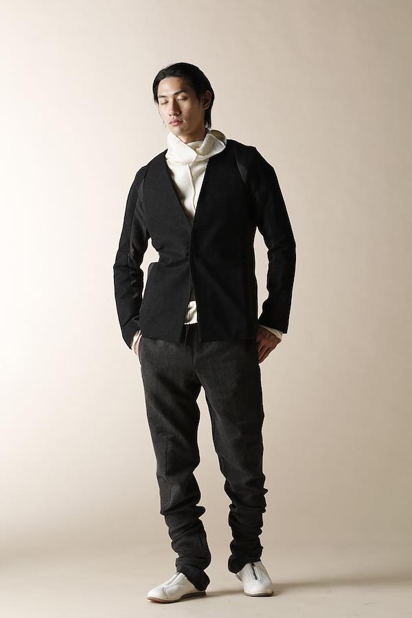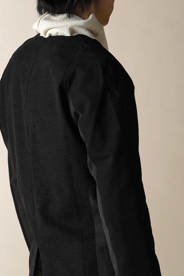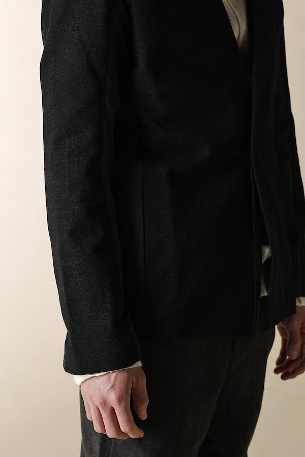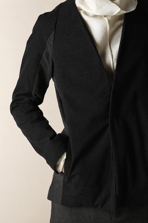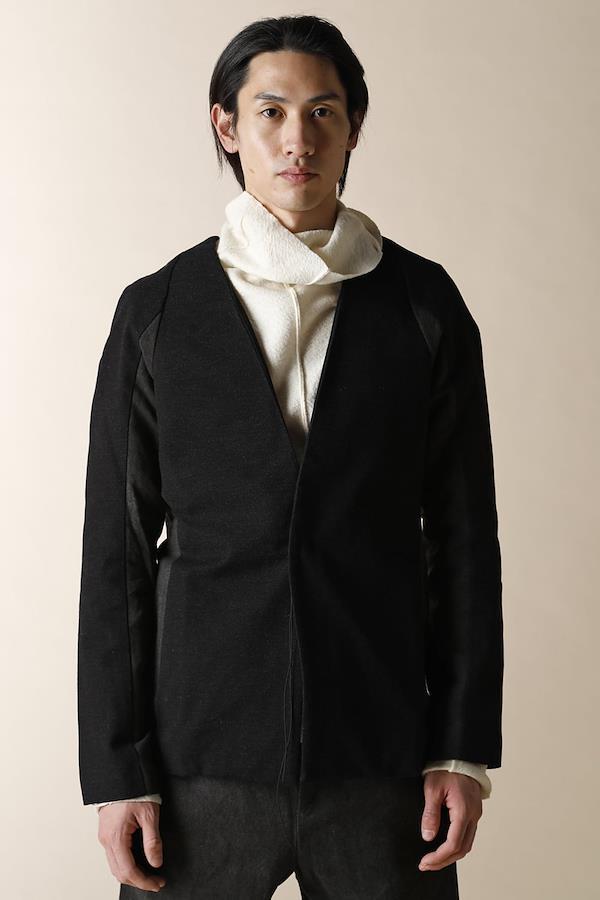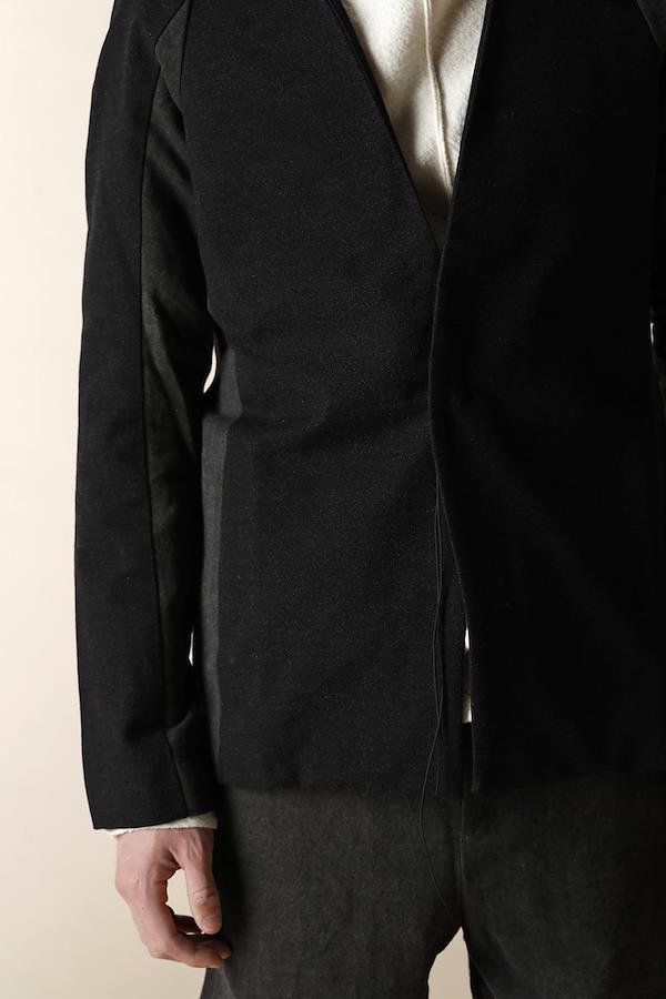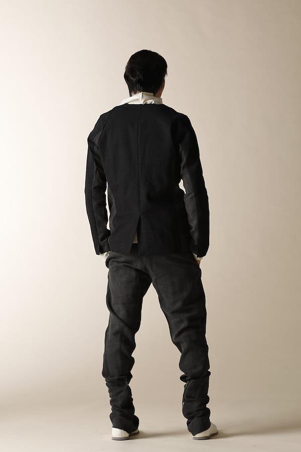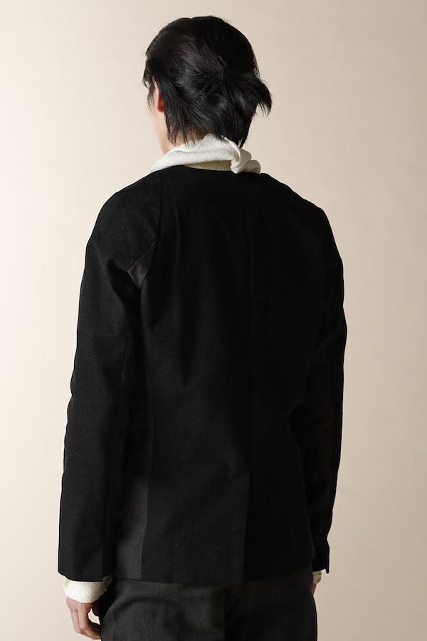 カラーレスのワンボタンジャケット・袖下&脇下の素材切り替えデザイン。