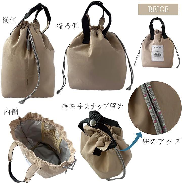 内側にメッシュポケット付き(ポケットx1)だから保冷剤などを入れるのに便利。 口部は大きく開いて使いやすい巾着タイプ。
