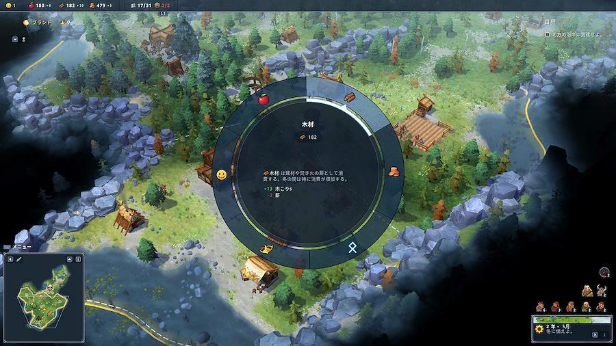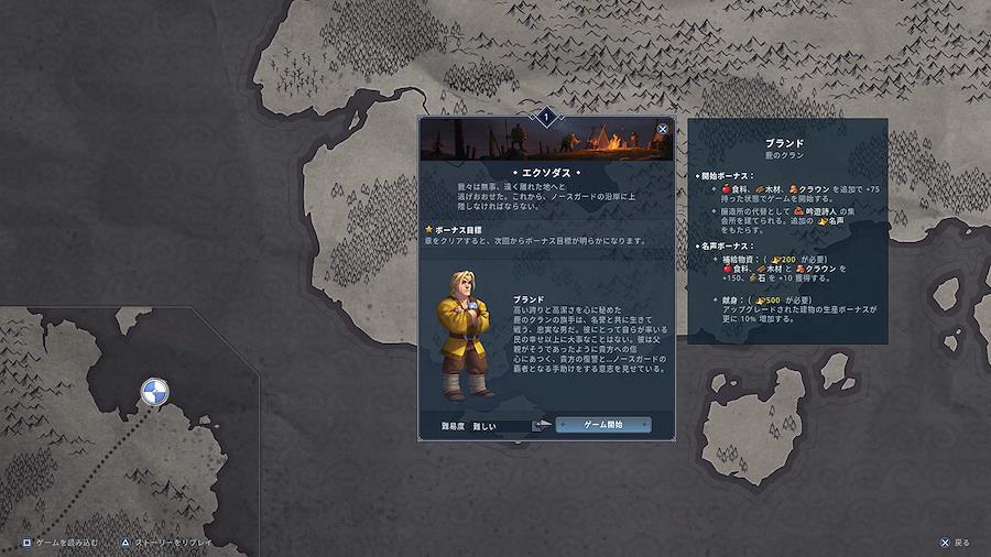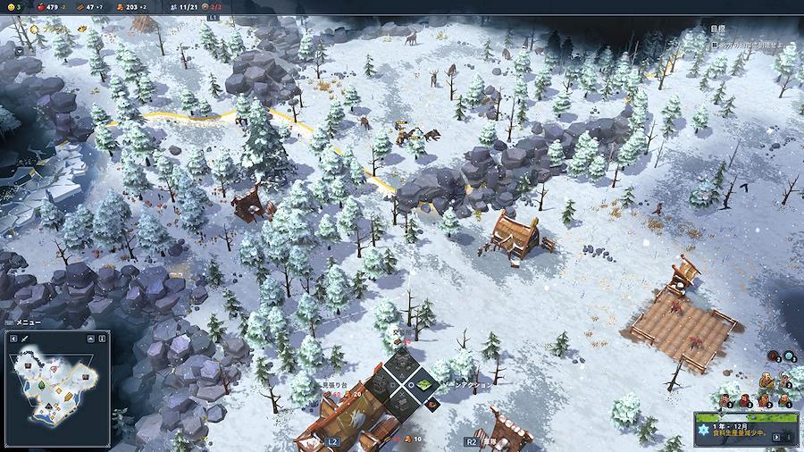 ゲームの流れ1「家」を建築し住人を増やす2住人に役割を与える(木材を集める木こり、土地を探索する斥候、敵と戦う軍事ユニット等)3探索し、土地を開拓(未開拓地に現れる獣やモンスターに注意 )4資源や素材を集めて施設を建築(資源の生産を安定化させて冬に備えよう )5各ステージのミッションを達成する(敵の土地を破壊するモンスターを倒す等様々なミッションが存在する)⇒1に戻る