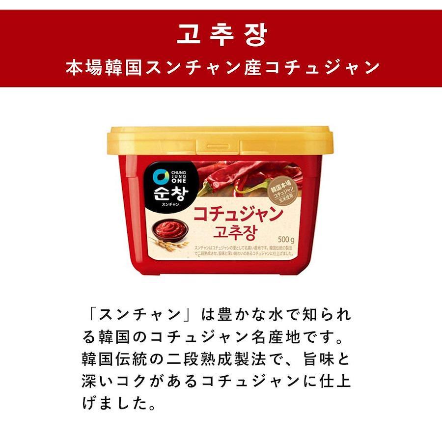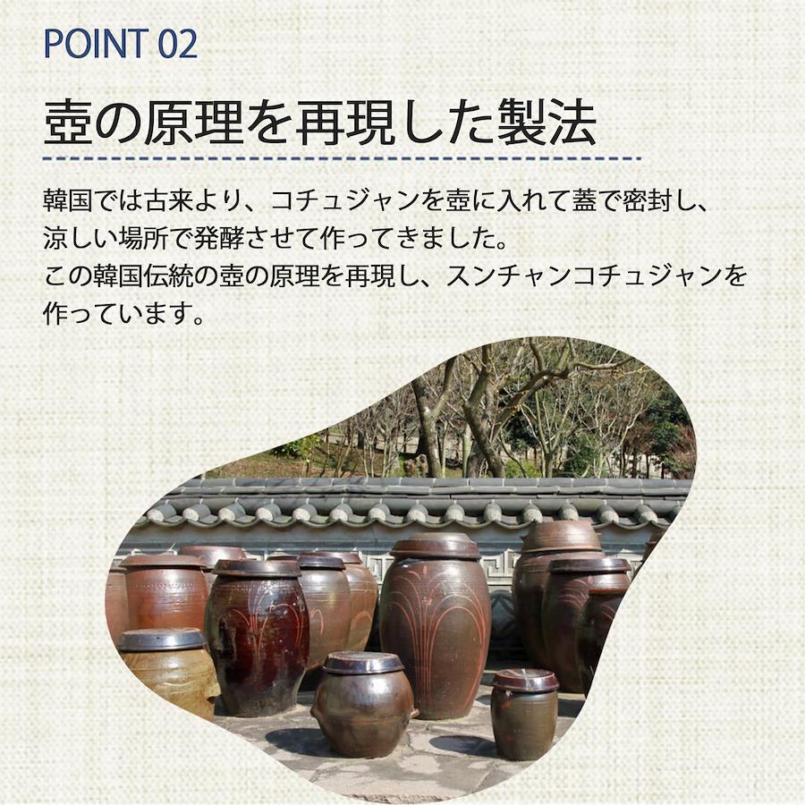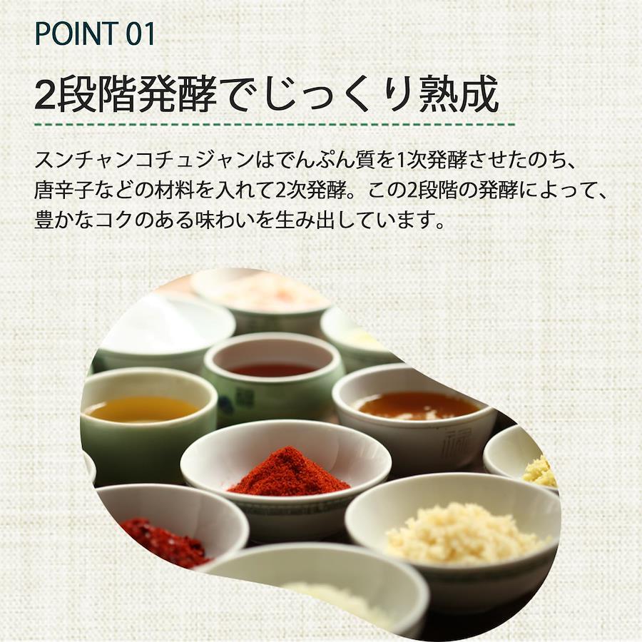 スンチャンはコチュジャンの里として名高い産地です。本場韓国で大人気のスンチャンコチュジャンは、伝統の製法で二段熟成させ、旨味と深い味わいのあるコチュジャンに仕上げました。