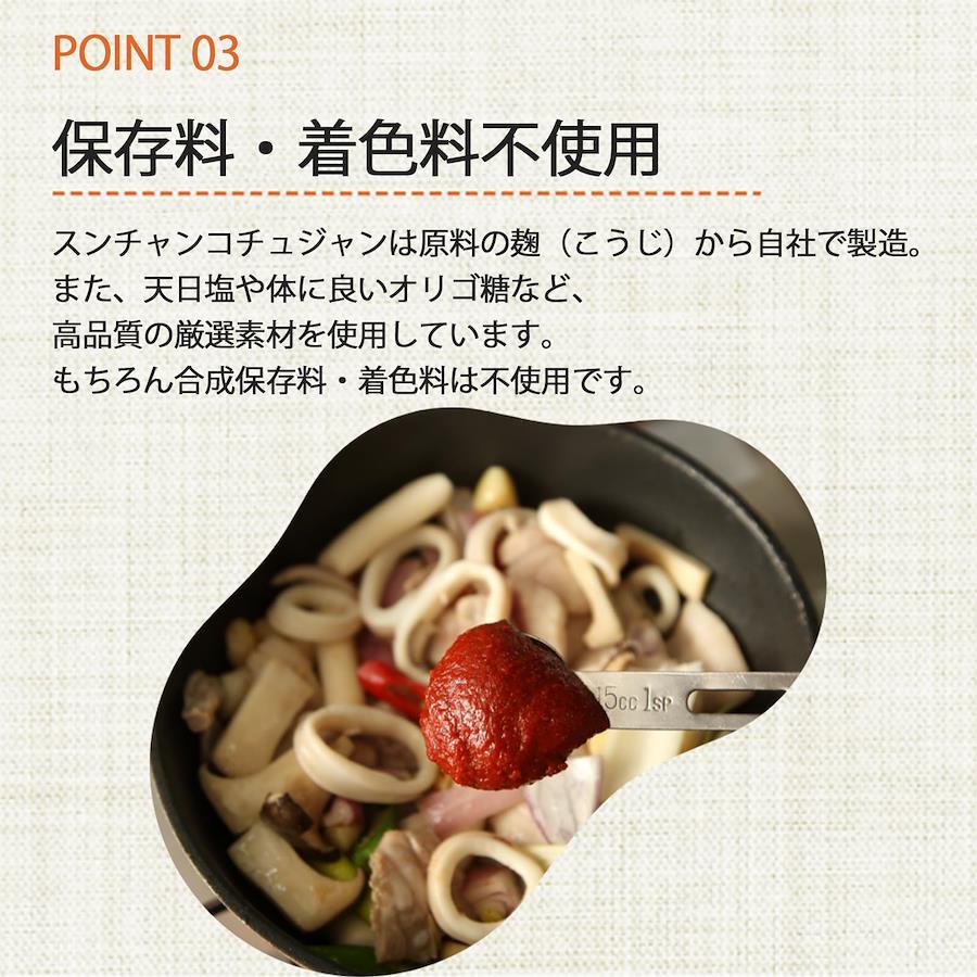 通常のスンチャンコチュジャンに加えてより辛みが引き立ったコチュジャンです。