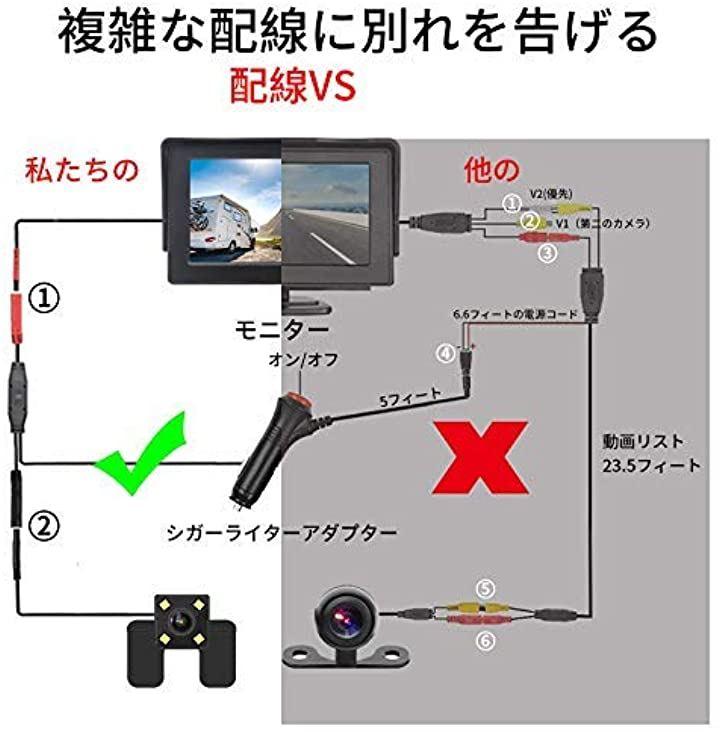 ・「ケーブル一本で配線終了」シガーソケット給電が簡単,従来の複雑かつ多数な配線を避け、ケーブル一本でモニターとカメラの接続が終了です。