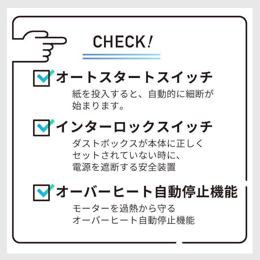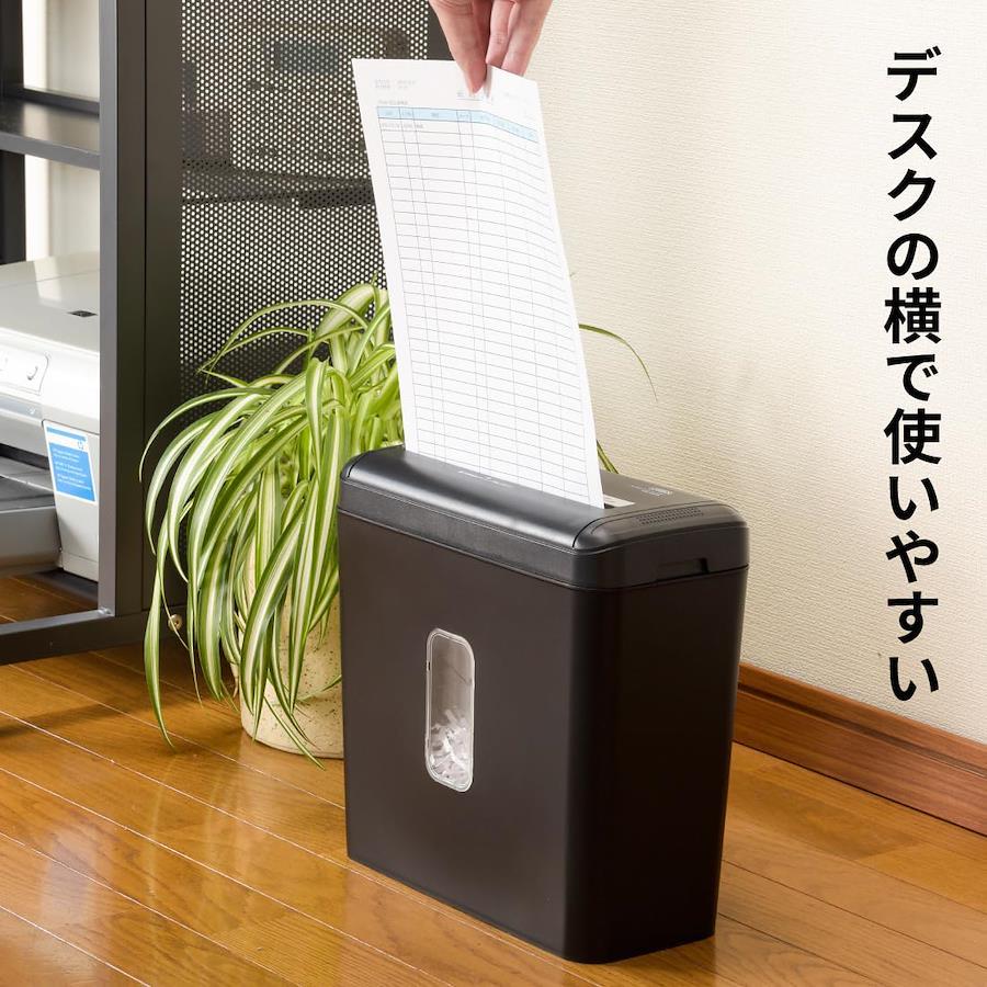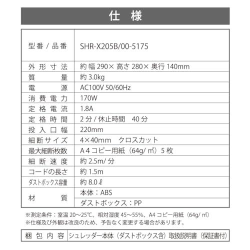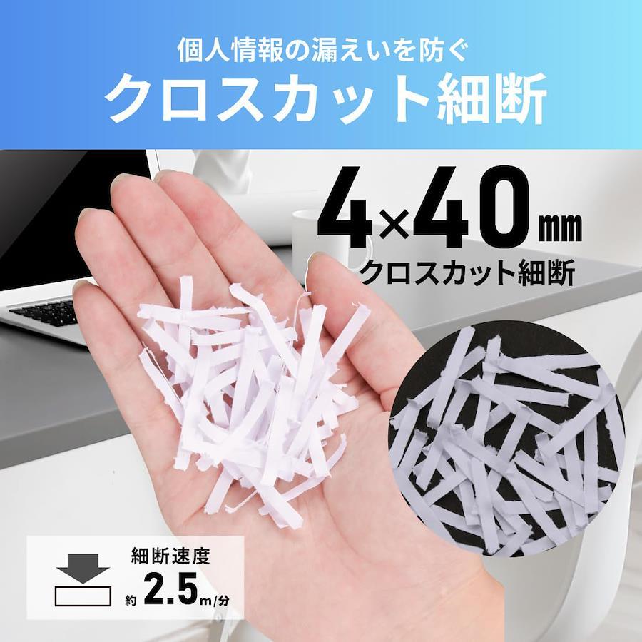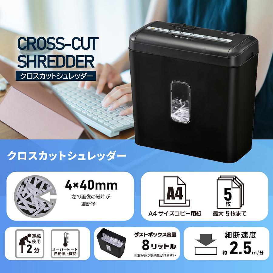 ● 細断サイズ4×40mmのクロスカットシュレッダー ● A4サイズ、コピー用紙5枚まで対応 ● ダストボックス容量は8リットル