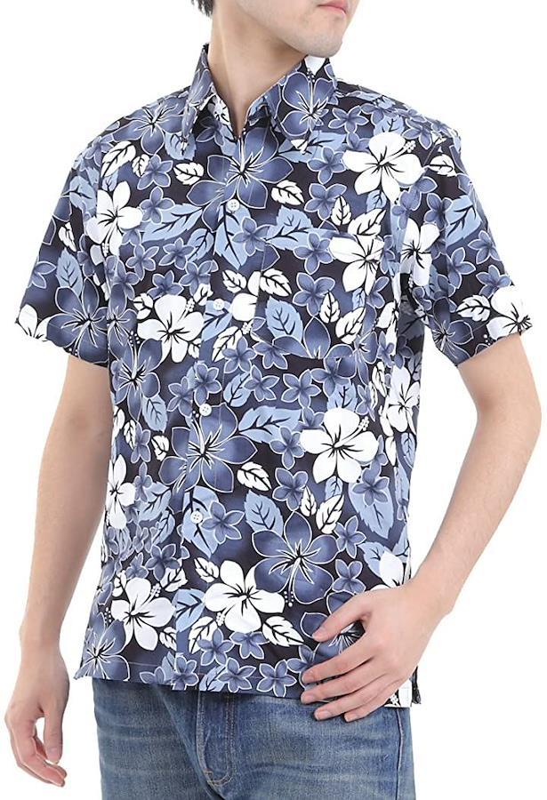ホワイトのハイビスカス柄が差し色となりハイセンスな色使いのアロハシャツです