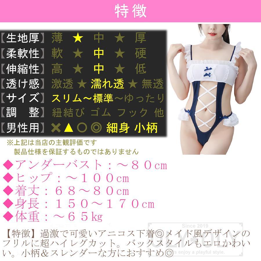 【商品内容】ハイレグレオタード+穴あきTバックショーツ+ニーハイストッキング=計3点セット 【サイズ】女性用フリーサイズ(S~L相当)アンダーバスト:~80cm、ヒップ:~100cm、着丈:68~80cm、身長:150~170cm、体重:~65㎏ 【カラー】ダークブルー(ストッキングとショーツのカラー・デザインはおまかせになります) 【特徴】過激で可愛いアニコス下着◎メイド風デザインのフリルに超ハイレグカット。バックスタイルもエロかわいい。コスプレのインナーとしてもおすすめ◎ ※他にもルームドレス・ベビードール・レオタード・マイクロビキニ・ムタンガなど、豊富なバリエーションをご用意しております 【使用上の注意】 洗濯はぬるま湯にて軽く手洗い・室内干しを推奨。色物は色落ちしますので白物と一緒の選択は避けてください。衣類に接着されているアクセサリーなどは洗濯により外れることがあります。海外製品につき、糸のほつれや縫製の甘い部分などはご了承願います。生産ロットにより予告なく仕様が変更されることがあり、写真と異なる場合は現物を優先とさせていただきます。下着類はデリケートな素材が多いため、着脱時に爪やアクセサリーなどで引っ掻いたりしないようご注意ください。 こんな用途におすすめ:ハロウィン・クリスマス・バレンタインデー・忘年会・新年会・コスプレパーティ等の余興、イベント衣装やインナーとして。インスタ・SNS・グラビア・記念写真など撮影用衣装として。結婚記念日・結婚祝い・婚約祝い・出産祝いなど記念日のプレゼントやジョークグッズとして。男性が着用可能なコスプレもございます。女装用・セックスレス・マンネリ化の解消にも。アニメキャラ・癒し・萌え・熟女・学生・SM系~過激ベビードール・極小マイクロビキニ・ボディストッキング・スクール水着など、人気セクシーランジェリーから注目のデザインをセレクト。 穴あき・胸開き・透ける素材・ハイレグ・Tバック・紐パン・レースなど、異なるバリエーションからお好みのセット・単品が選べます。梱包サイズ?:?22.9x17.2x3cm;100gでの取り扱い開始日?:?2022/1/29メーカー?:?OLYOLYASIN?:?B09RJ6KK1Q売れ筋ランキング:ドラッグストア-193,267位(ドラッグストアの売れ筋ランキングを見る)アダルト用コスチューム-2,338位カスタマーレビュー:5.05つ星のうち5.02個の評価vardpAcrHasRegisteredArcLinkClickAction;P.when('A','ready').execute(function(A){if(dpAcrHasRegisteredArcLinkClickAction!==true){dpAcrHasRegisteredArcLinkClickAction=true;A.declarative('acrLink-click-metrics','click',{"allowLinkDefault":true},function(event){if(window.ue){ue.count("acrLinkClickCount",(ue.count("acrLinkClickCount")||0)+1);}});}});P.when('A','cf').execute(function(A){A.declarative('acrStarsLink-click-metrics','click',{"allowLinkDefault":true},function(event){if(window.ue){ue.count("acrStarsLinkWithPopoverClickCount",(ue.count("acrStarsLinkWithPopoverClickCount")||0)+1);}});});(#lf)(#lf)(#lf)商品購入前に、ストア紹介ページをご確認ください。