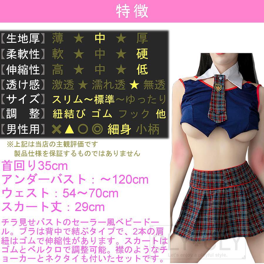 【商品内容】セーラー風ベビードール(トップス+ミニスカート+チョーカー+ネクタイ+)+ニーハイストッキング+穴あきTバックショーツ=計6点セット 【サイズ】女性用フリーサイズ(S~L相当)、首回り35cm、アンダーバスト:~120cm、ウェスト:54~70cm、スカート丈:29cm 【カラー】ブルー×レッド チェック柄スカート(ストッキングとショーツのカラー・デザインはおまかせになります) 【特徴】チラ見せバストのセーラー風ベビードール。ブラは背中で結ぶタイプで、2本の肩紐はゴムで伸縮性があります。スカートはゴムとベルクロで調整可能。襟のようなチョーカーとネクタイも付いたセットです。 ※他にもルームドレス・ベビードール・レオタード・マイクロビキニなど、豊富なバリエーションをご用意しております 【使用上の注意】 洗濯はぬるま湯にて軽く手洗い・室内干しを推奨。色物は色落ちしますので白物と一緒の選択は避けてください。衣類に接着されているアクセサリーなどは洗濯により外れることがあります。海外製品につき、糸のほつれや縫製の甘い部分などはご了承願います。生産ロットにより予告なく仕様が変更されることがあり、写真と異なる場合は現物を優先とさせていただきます。下着類はデリケートな素材が多いため、着脱時に爪やアクセサリーなどで引っ掻いたりしないようご注意ください。 こんな用途におすすめ:ハロウィン・クリスマス・バレンタインデー・忘年会・新年会・コスプレパーティ等の余興、イベント衣装やインナーとして。インスタ・SNS・グラビア・記念写真など撮影用衣装として。結婚記念日・結婚祝い・婚約祝い・出産祝いなど記念日のプレゼントやジョークグッズとして。男性が着用可能なコスプレもございます。女装用・セックスレス・マンネリ化の解消にも。アニメキャラ・癒し・萌え・熟女・学生・SM系~過激ベビードール・極小マイクロビキニ・ボディストッキング・スクール水着など、人気セクシーランジェリーから注目のデザインをセレクト。 穴あき・胸開き・透ける素材・ハイレグ・Tバック・紐パン・レースなど、異なるバリエーションからお好みのセット・単品が選べます。梱包サイズ?:?27.4x15.4x2.8cm;160gでの取り扱い開始日?:?2021/4/30メーカー?:?OLYOLYASIN?:?B093WXJK5Y売れ筋ランキング:ドラッグストア-235,650位(ドラッグストアの売れ筋ランキングを見る)アダルト用コスチューム-2,970位カスタマーレビュー:5.05つ星のうち5.01個の評価vardpAcrHasRegisteredArcLinkClickAction;P.when('A','ready').execute(function(A){if(dpAcrHasRegisteredArcLinkClickAction!==true){dpAcrHasRegisteredArcLinkClickAction=true;A.declarative('acrLink-click-metrics','click',{"allowLinkDefault":true},function(event){if(window.ue){ue.count("acrLinkClickCount",(ue.count("acrLinkClickCount")||0)+1);}});}});P.when('A','cf').execute(function(A){A.declarative('acrStarsLink-click-metrics','click',{"allowLinkDefault":true},function(event){if(window.ue){ue.count("acrStarsLinkWithPopoverClickCount",(ue.count("acrStarsLinkWithPopoverClickCount")||0)+1);}});});(#lf)(#lf)(#lf)商品購入前に、ストア紹介ページをご確認ください。