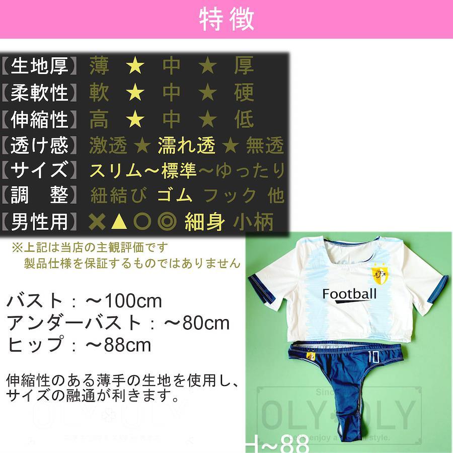フィットタイプ ストレッチ【商品内容】サッカー ユニフォーム風 スポーツビキニ 上下セット+ニーハイソックス+ストッキング+穴あきTバックショーツ=計4点セット【サイズ】女性用フリーサイズ(S~L相当)バスト:~100cm(アンダーバスト:~80cm)、ヒップ:~88cm【カラー】ブルー×ホワイト、ソックスは白地に青ライン(ストッキングとショーツのカラー・デザインはおまかせになります)【特徴】伸縮性のある薄手の生地を使用し、サイズの融通が利きます。(#lf)(#lf)(#lf)商品購入前に、ストア紹介ページをご確認ください。