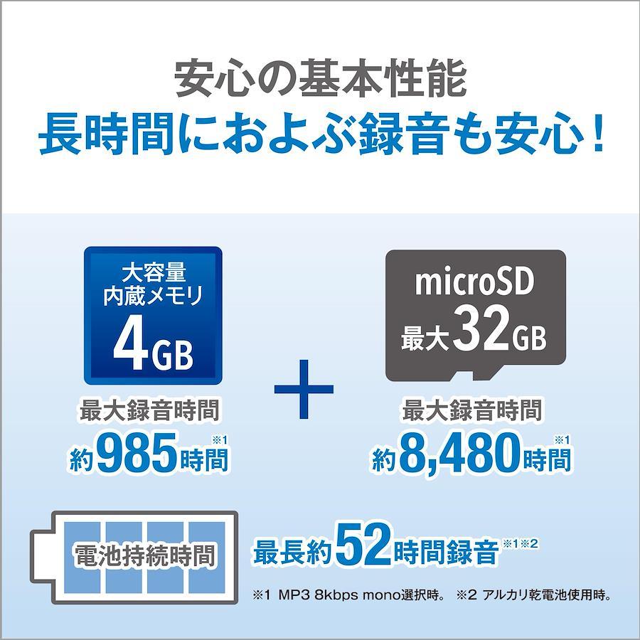 対応デバイス パソコンブランド OM SYSTEM/オリンパスハードウェアインターフェイス MicroSD, USBマイク波形率 内蔵フォーマット 不明な形式電池の個数 1 単4形 電池(付属)商品寸法 (長さx幅x高さ) 40 x 14 x 106 mmメモリストレージ容量 4 GB商品の重量 72 グラム電池寿命 52 Hours