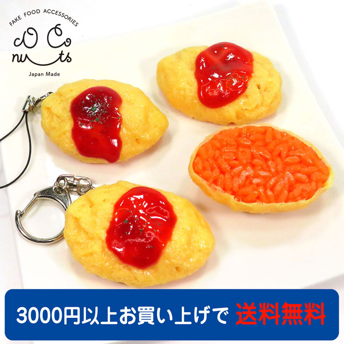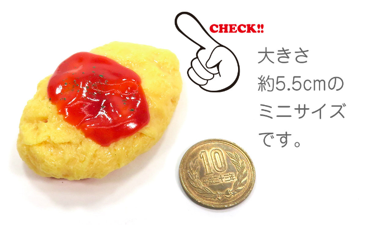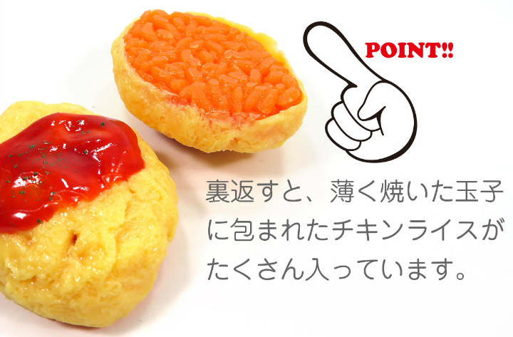 チキンライスを薄焼き玉子で包んだオムライスの食品サンプルです。ふわふわ玉子の中にはオレンジ色のチキンライスがたっぷり入っています。