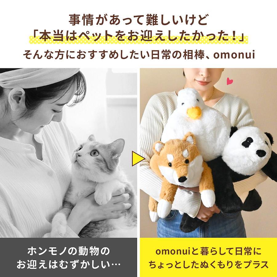 【omonui - おもぬい】オトナだってもふもふに癒されたい!頑張る日々の暮らしの中にやわらかあたたかで優しくずっしりなomonui が癒やしの時間をお届けします。今までに感じた事のない ずっしり 2kg のomonui は抱きしめると想像以上の生き物感 に、思わず感動。膝にのせて映画を見たりデスクワーク中の癒しにしたり一緒にベッドで夢を見たり 楽しみ方は無限大です。ご自身にはもちろん、大切な方へのプレゼントにもおすすめです。