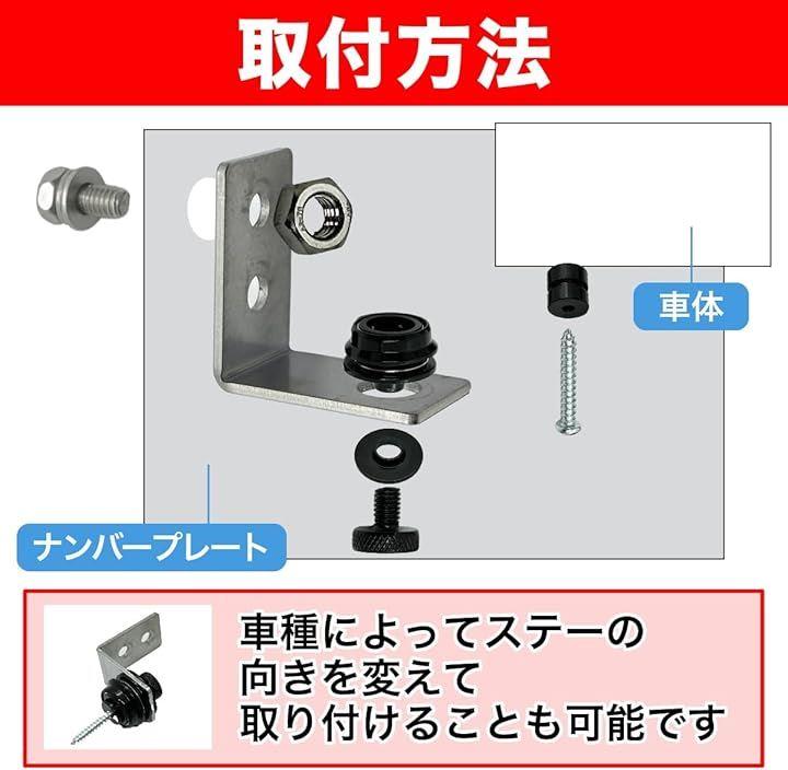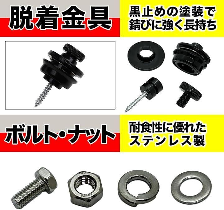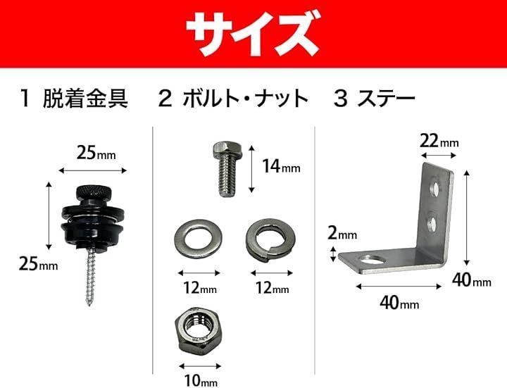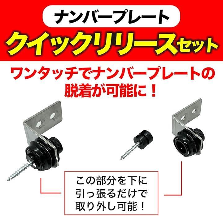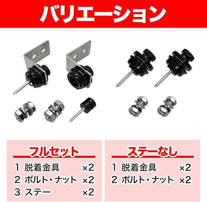 「バリエーション」 フルセット / ステーなし 「セット内容」 フルセット(脱着金具x2、ボルトナット(M6x14ミリ)x2、ナンバー取付ステーx2) / ステー無し(脱着金具x2、ボルトナット(M6x14ミリ)x2) 「使用方法」 上部の丸いリングを引っ張るだけで取付、取り外しが簡単にできます。
