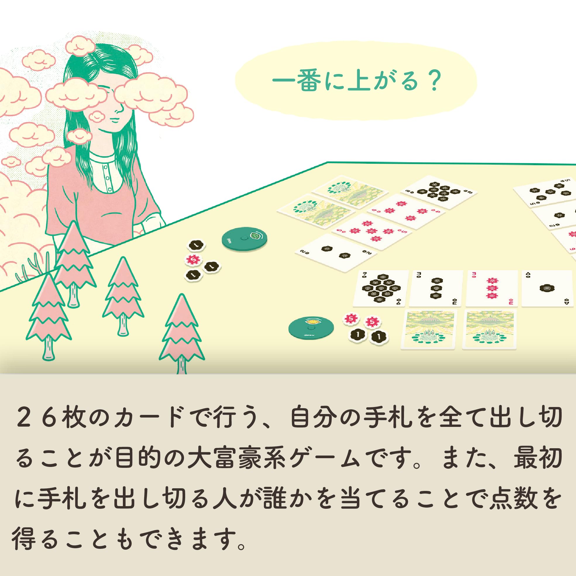 通常1-5営業日で発送【新品未開封品】デザイナー:Takashi Saitoゲームマーケット2022秋の注目作がついに商業版に!手札の出し切りを目指す大富豪系ですが、手札がほとんど公開情報で、勝者を予想して当てることでも点数を稼ぐことができます!商業版になったことで、箱のサイズがアップして、組み立て済みの回転式予想ディスクや得点チップが付属しました。何度でも遊べるカードゲームです!