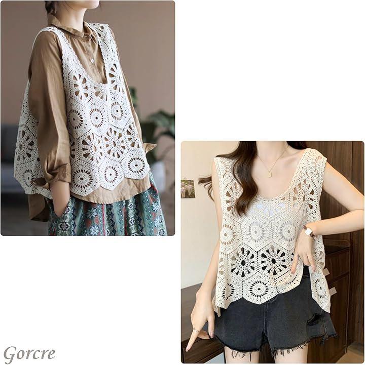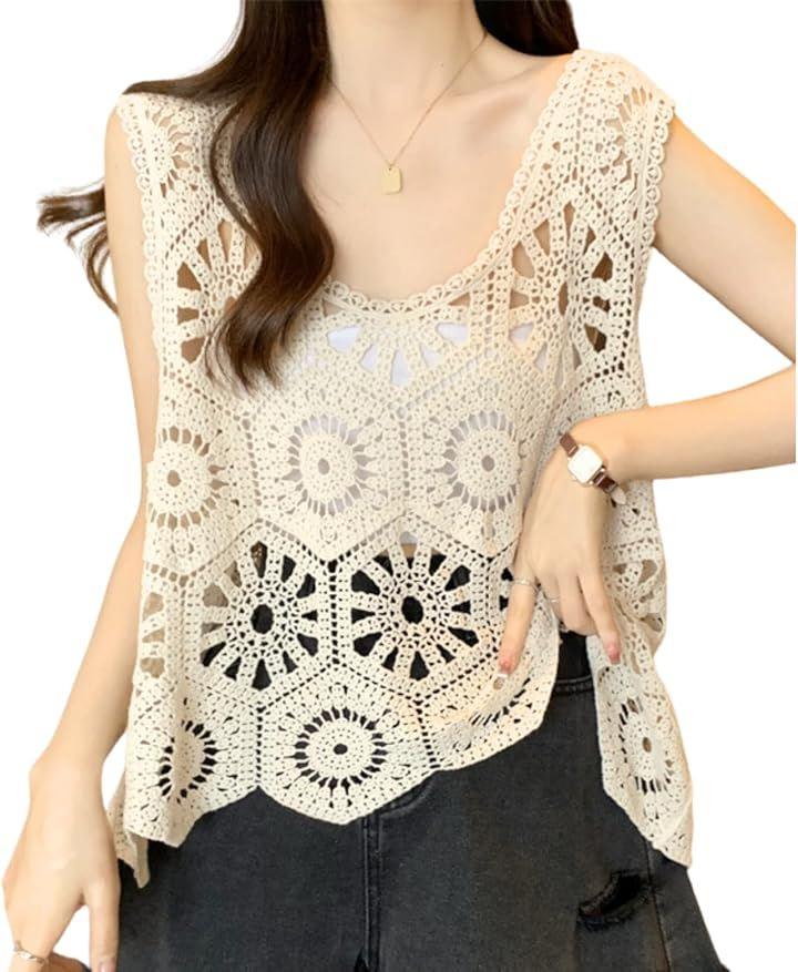 Openwork knit vest for women, sleeveless, cropped, short length, embroidered, stylish, slimming, body covering