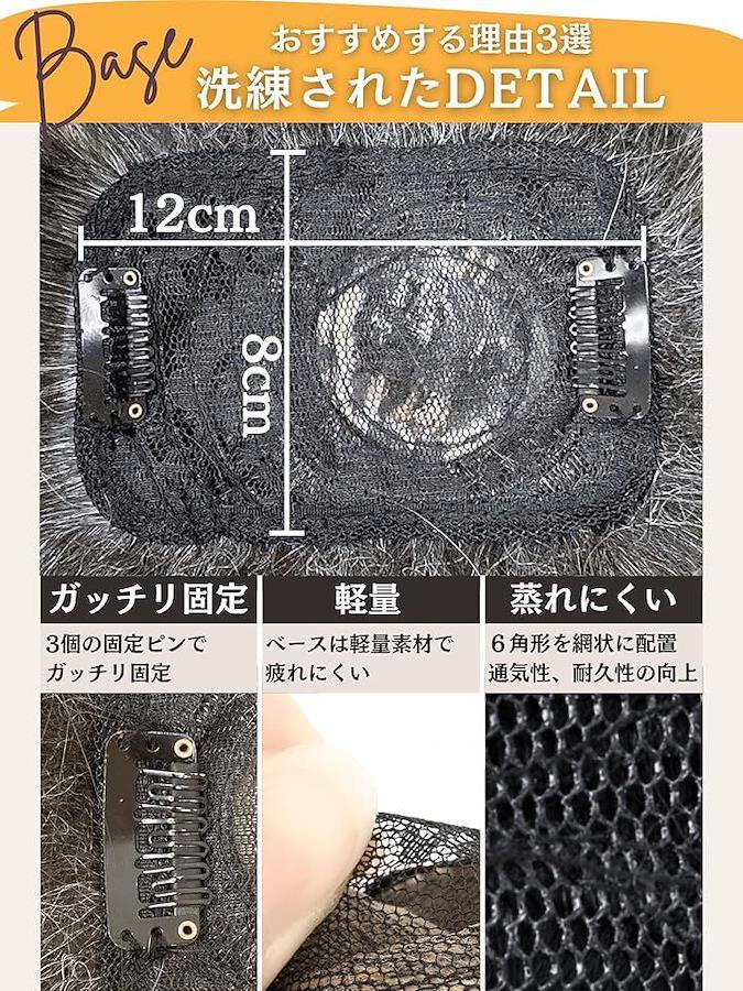 「3つの特徴」(6) 「特徴1」つむじや頭頂部周りの薄毛や生え際の白髪にお悩みの、ウィッグ、付け毛、カツラ初心者に最適の商品。