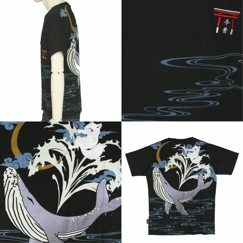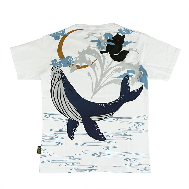【デザイン】和柄ブランド今昔から半袖Tシャツの登場。鯨と戯れ 和柄 半袖Tシャツです。実は仲良し! 鯨と水遊びで戯れです。今年は海水浴でレッツホエール&狐ウォッチング 。もしかしたら生で見れるかも。とプリントで豪華なデザインに仕上がりました。