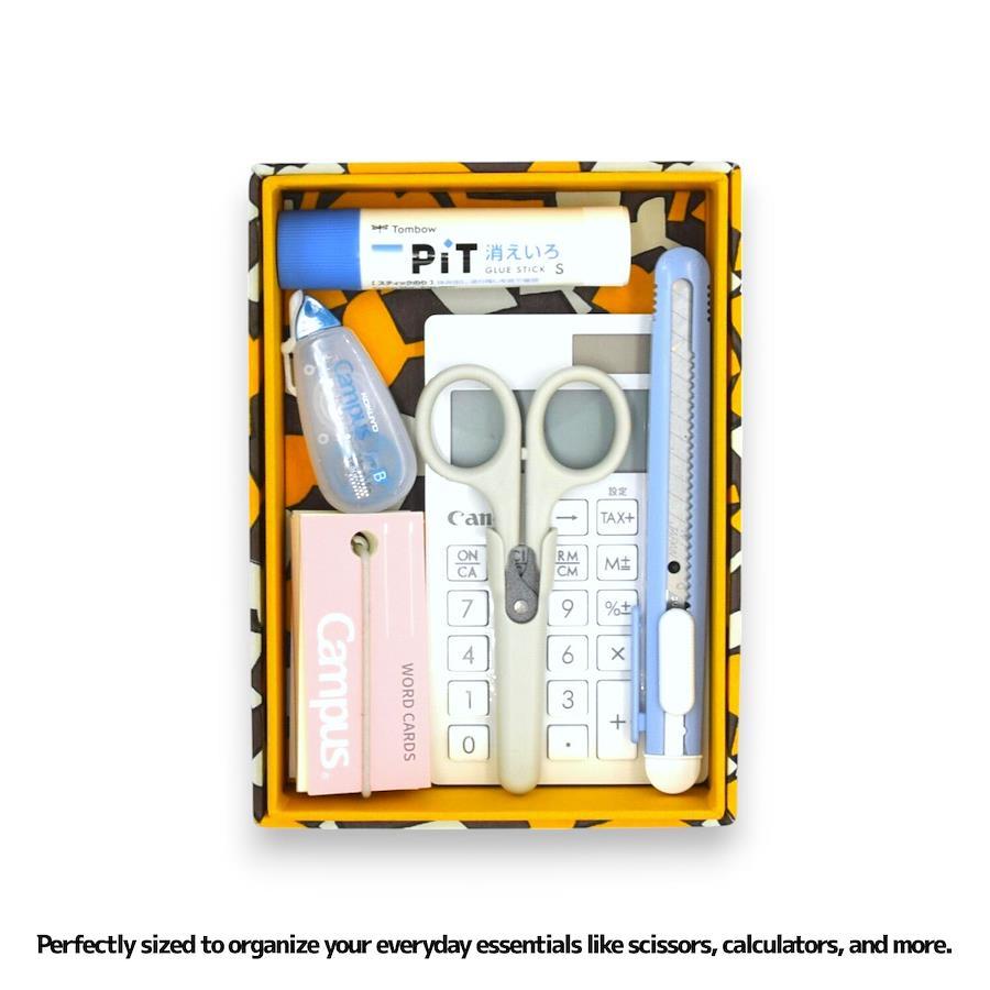 貼り箱ケースは、ハサミや計算機、のり、カッターなど、さまざまな文房具が収まるちょうどよいサイズ感。