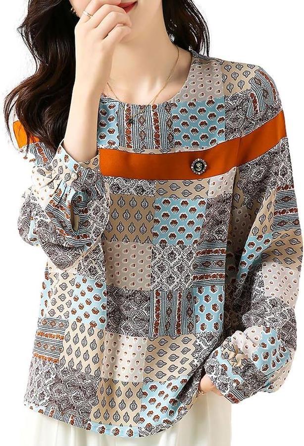 パッチワークのように様々な生地をつなぎ合わせたようなロマンチックなプリントが、フレンチシックなムード漂うブラウス。