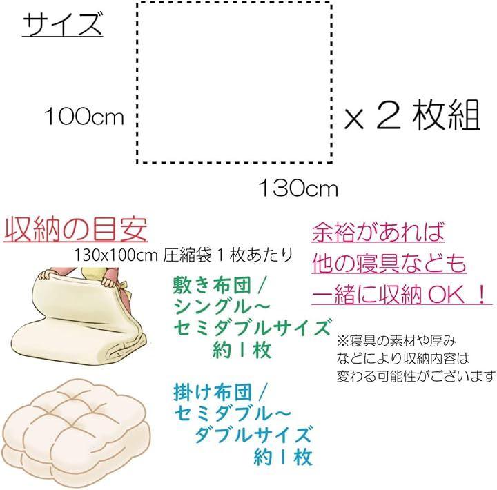 収納目安(圧縮袋1枚あたり):敷き布団 セミダブルまで 1枚・掛け布団 ダブルまで 1枚 *収納物の厚みなどにより収納量は変わる場合がございます