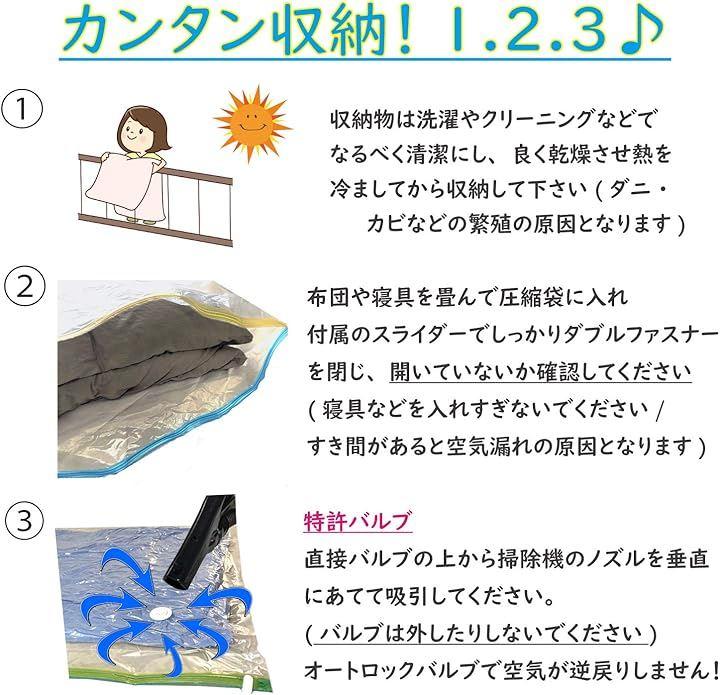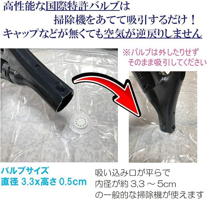 ・掃除機でカンタン。特許スピードバルブ付き圧縮袋でかさばる布団をカンタン/スピード圧縮。 ・特許バルブは空気が逆戻りしにくく、掃除機でカンタンに吸引できます。