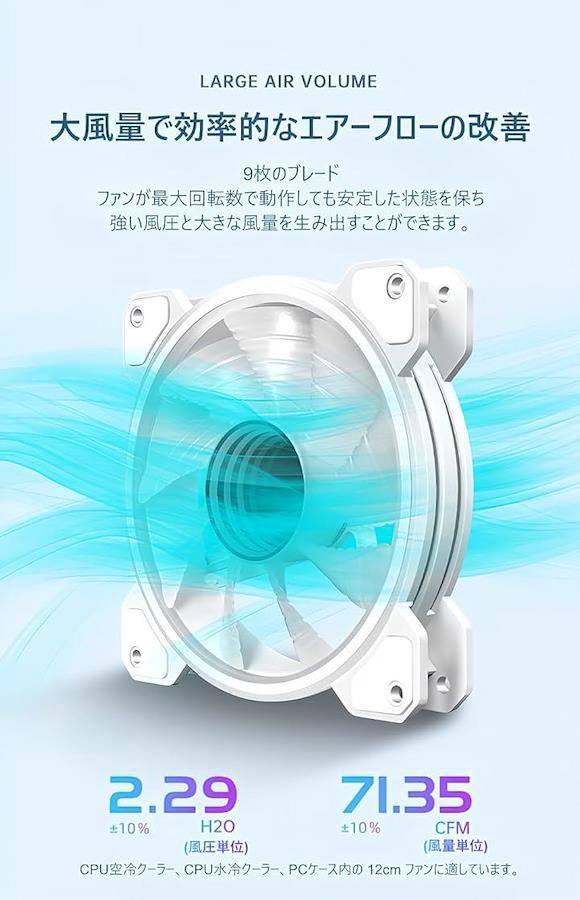 「特徴」PCのエアーフローを改善し冷却することができます。LED搭載でゲーミングPCを彩ることができます。