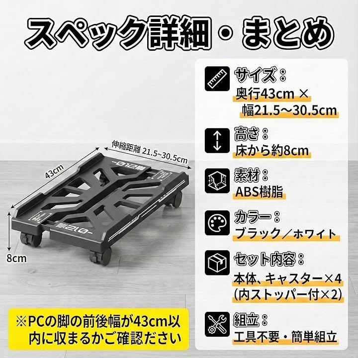 「360度回転キャスターで移動も掃除も楽々」4つのキャスターは360度スムーズに回転し、重いパソコンも指一本で動かせます。