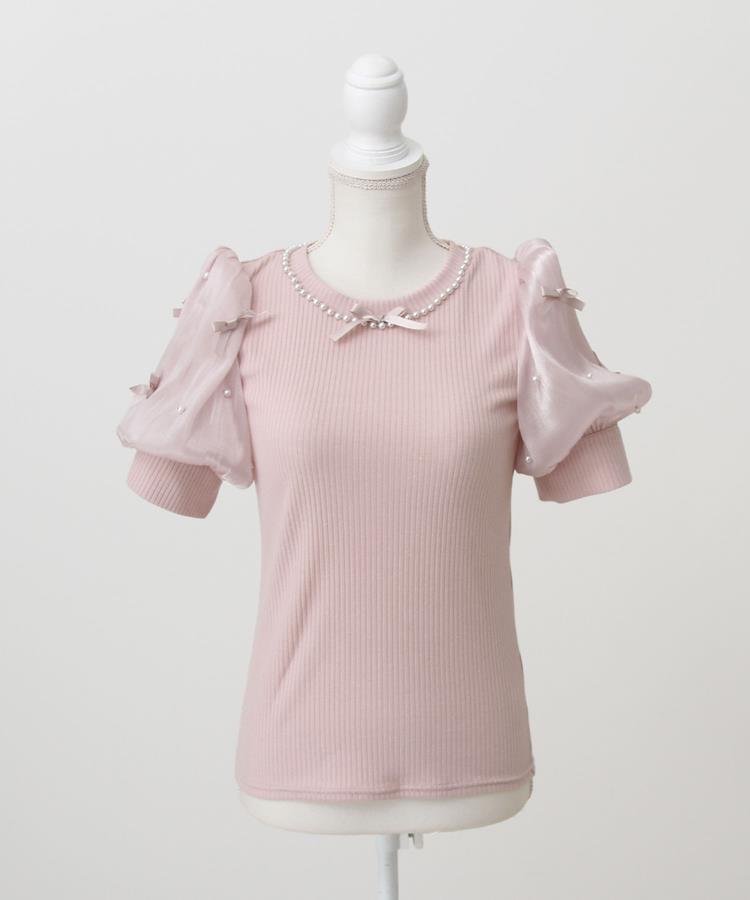 まるでお姫様のようなパフ袖♪ネックレスデザインがかわいいリブカットトップス。