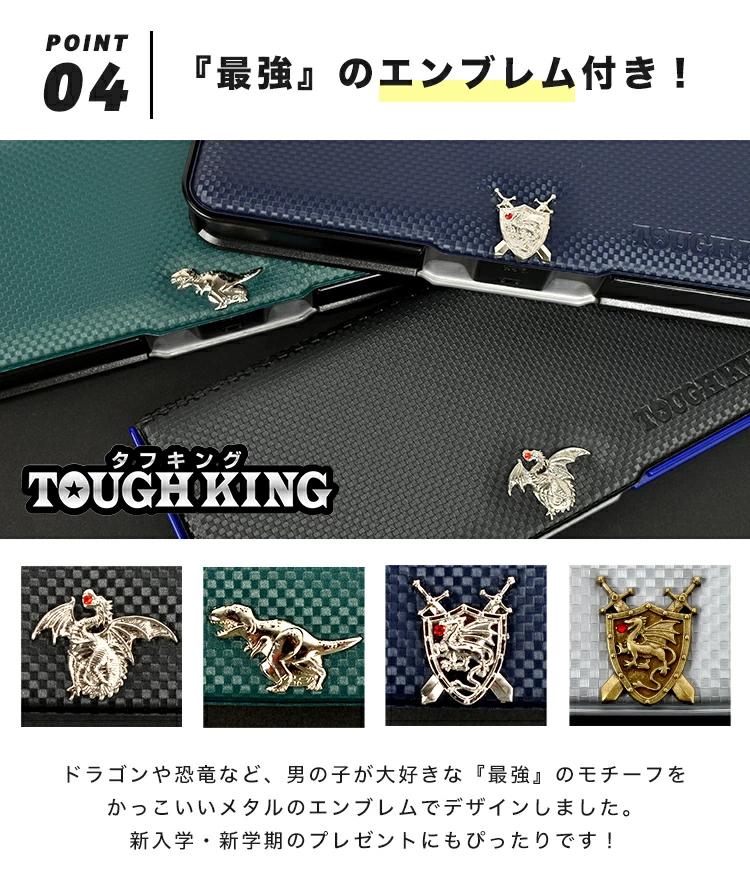 【タフキング ペンケース】強い王様のように立派に育ってほしい。そんな願いを込めて作られた、ドラゴンや恐竜のエンブレムがかっこいい筆箱です。中皿部分に強化プラスチックを使用しているので落としても割れにくいのが特徴!元気な男の子が持っても安心の作りです。ランドセルにぴったり収まる薄くコンパクトなデザインながら、学校で必要なものが全部入る収納力!日本PTA全国協議会推薦の確かな品質のアイテムなので、新学期・新入学のプレゼントにもぴったりです。