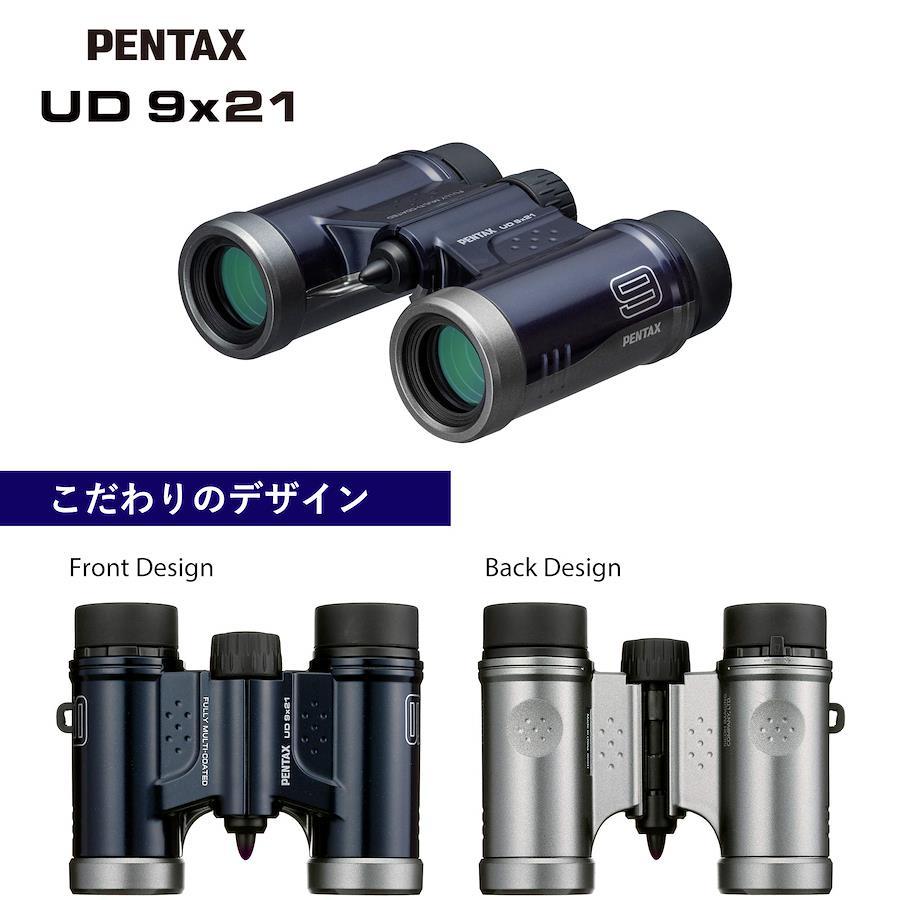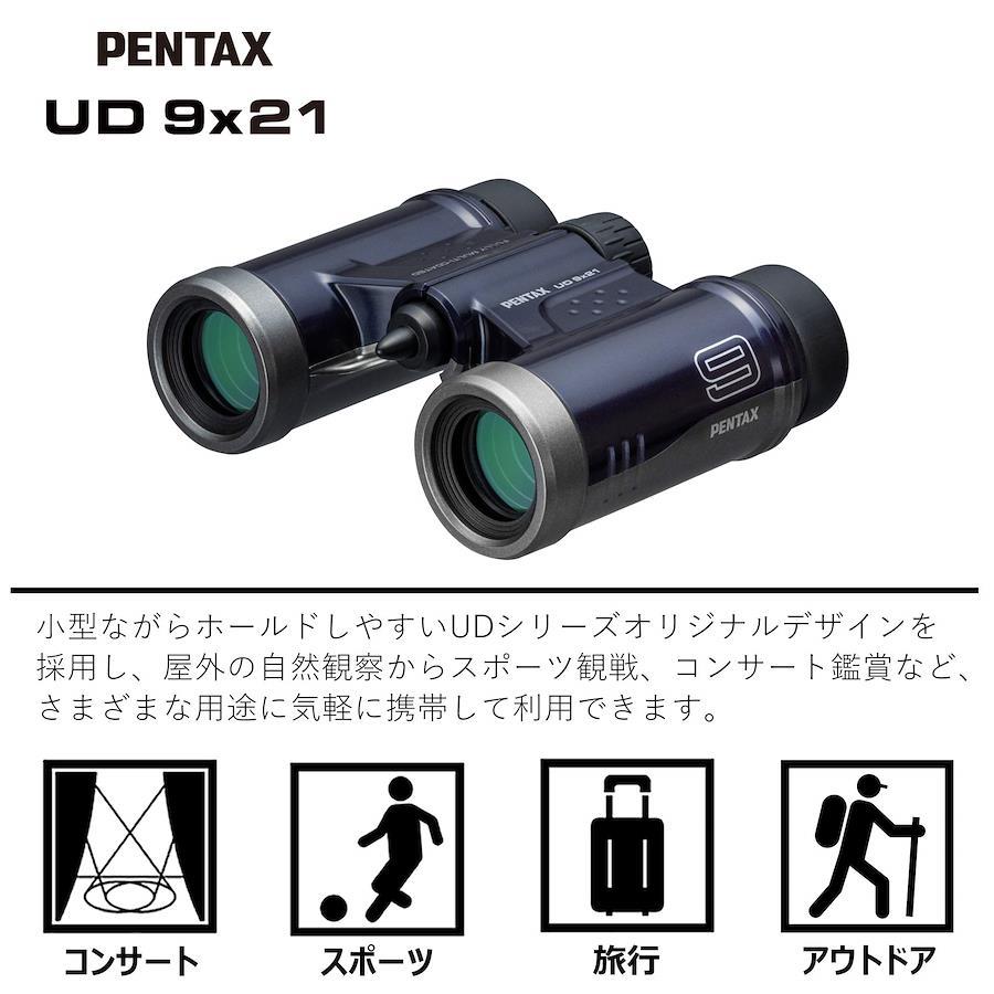 3営業日以内に発送≪新品未開封品≫:<PENTAX UD 9x21の主な特長> 1.小型軽量設計 小さな手にも収まりやすい小型フォルムと、現行のPENTAX双眼鏡では最軽量となる約195gの小型軽量設計です。小型ながらホールドしやすいUDシリーズオリジナルデザインを採用し、屋外の自然観察からスポーツ観戦、コンサート鑑賞など、さまざまな用途に気軽に携帯して利用できます。 2.明るくクリアな視界 光学系に不要な光の反射を防止するマルチコーティングを施して、フレアやゴーストを抑えた良好な像性能を実現しています。「PENTAX UD 9x21」は、全ての反射面にマルチコーティングを施したフルマルチコーティングとすることで、特に見やすく明るい視界を確保しています。 3.その他 ①より近くの目標物も見ることができる、約3mの最短ピント距離 ②滑り止めがついたリング形状で操作しやすい視度調整機構 ③別売アクセサリー「三脚アダプターTP-3」(発売中)を利用して三脚への取り付けが可能