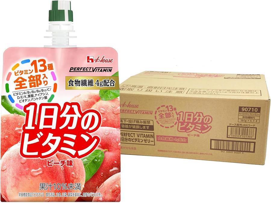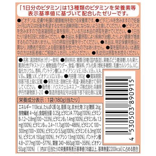 エネルギー 110kcal、たんぱく質 0g、脂質 0g、炭水化物 31g、食塩相当量 0.25g、ビタミンA 770μg、ビタミンB1 1.2~2.8mg、ビタミンB2 1.4mg、ビタミンB6 1.3mg、ビタミンB12 2.4~11.7μg、ビタミンC 100~300mg、ビタミンD 5.5μg、ビタミンE 6.3mg、ビタミンK 150μg、ナイアシン 13mg、パントテン酸 4.8~27.7mg、葉酸 240~710μg、ビオチン 50μg 原材料:糖類(砂糖(国内製造)、果糖ぶどう糖液糖)、もも果汁、難消化性デキストリン、植物 油脂パウダー、食塩/酸味料、ゲル化剤(増粘多糖類)、乳酸カルシウム、V.C、塩化 カリウム、香料、パントテン酸Ca、ナイアシン、V.E、V.B1、V.B2、V.A 、V.B6、葉酸、V.K、ビオチン、V.D、V.B12 内容量:180g×24個 カロリー:[栄養成分表示:1袋(180g)当たり]110 kcal 商品サイズ(高さx奥行x幅):15.4cm×25.8cm×34.4cm 原産国:日本 (#lf)(#lf)(#lf)商品購入前に、ストア紹介ページをご確認ください。