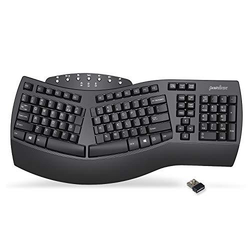 左右分割型エルゴノミクスデザインキーボード:キーが中央で左右に分かれて扇状に並んでおり、手や指を自然な形でタイピングすることができます。また一体型パームレストを使用しており、タイプ中の腕や手首を快適にサポートし、手根管症候群や腱鞘炎を予防することができます