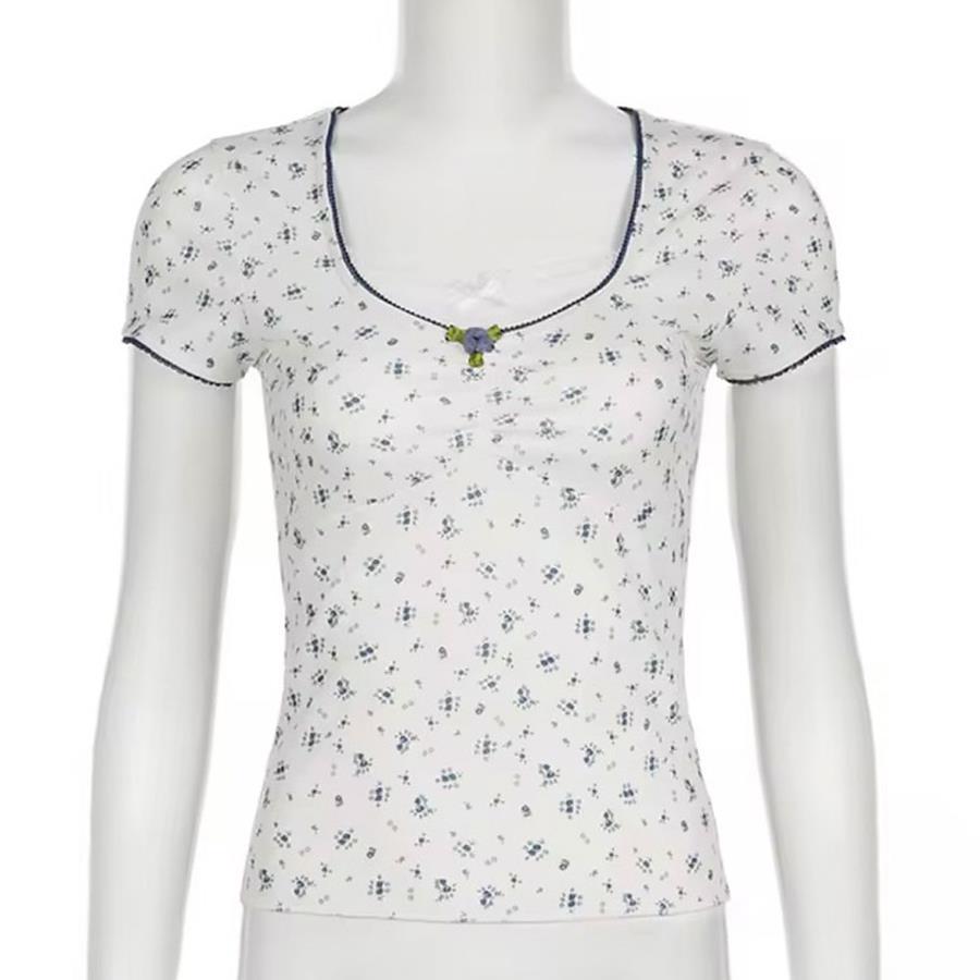 ◆Design小さなRose柄が施された細リブの半袖カットソートップスロマンティックな雰囲気バレエコアコーデにGOOD!細リブの素材感がほどよくボディラインにフィットし、上品で洗練されたシルエットを作り出します。胸元には花がついててチラ見せレースも本体についているので1枚で楽々コーデ。